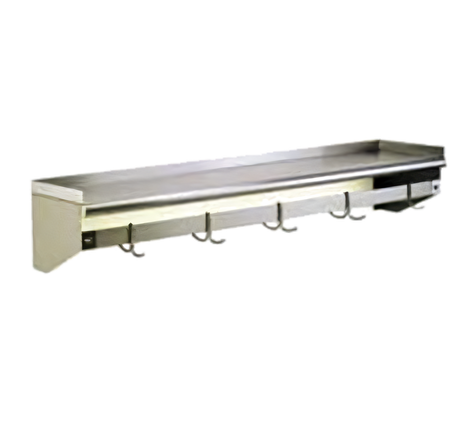 Wall Shelf, wall mount with pot rack, 108"W x 18"D, rolled front edge, 1-1/2"H up-turn on sides & rear, 304 stainless steel pot rack bar, includes (9) double-prong stainless steel hooks, 16/430 stainless steel, construction, NSF