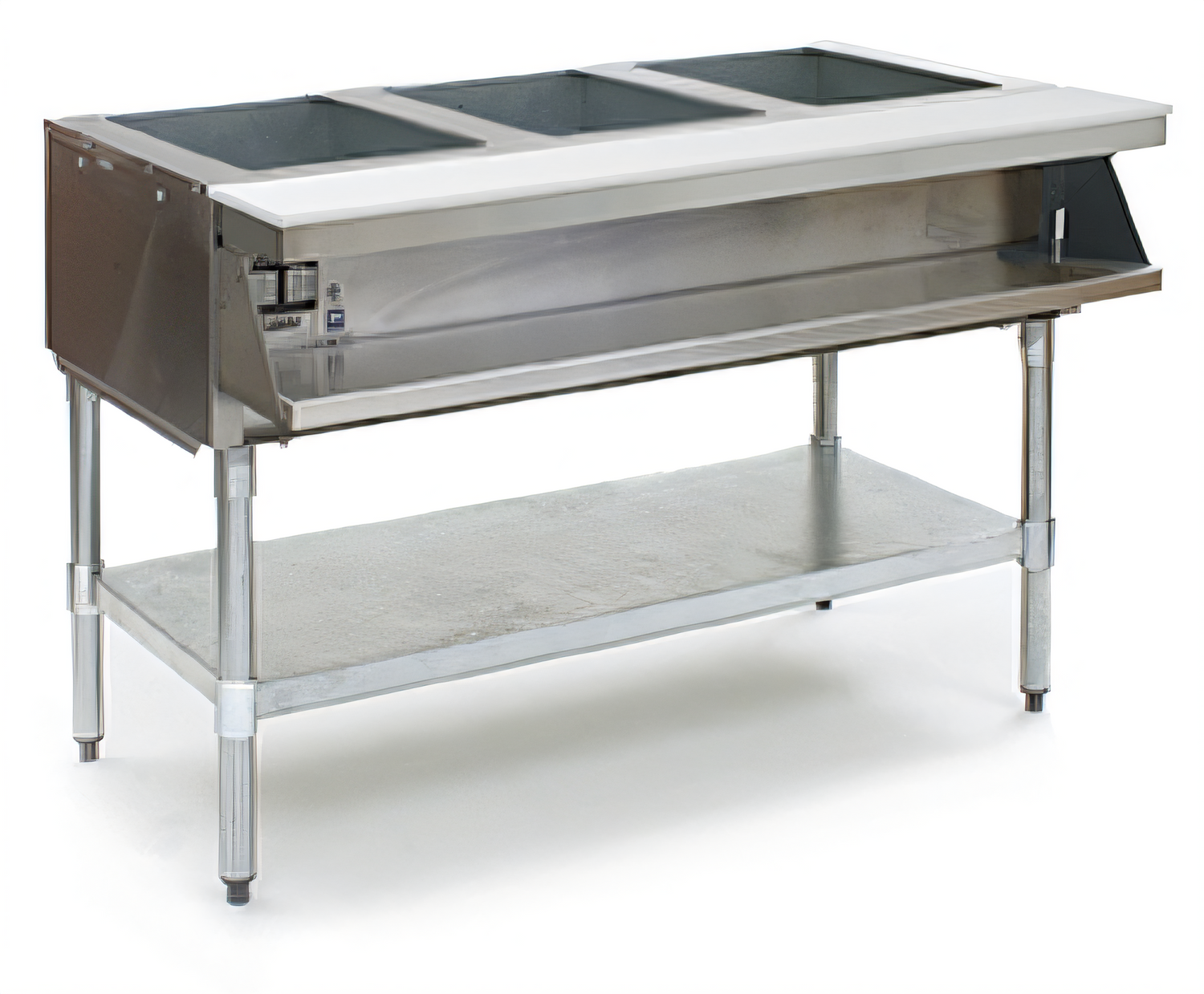 Water Bath Hot Food Table, electric, 48"W, (3) 12" x 20" openings, low water cut-off, stainless steel water pan, top & enclosure, 8"D polyethylene cutting board, stainless steel plate shelf, galvanized legs & undershelf, adjustable feet, 240v/60/1-ph, 3000w, 12.5 amps, NSF, cULus