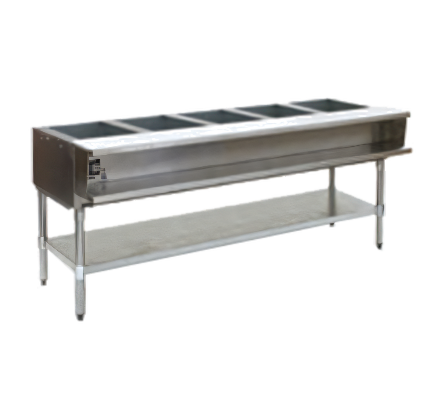 Water Bath Hot Food Table, electric, 79"W, (5) 12" x 20" openings, low water cut-off, stainless steel water pan, top & enclosure, 8"D polyethylene cutting board, stainless steel plate shelf, galvanized legs & undershelf, adjustable feet, 240v/60/1-ph, 5000w, 20.8 amps, NSF, cULus