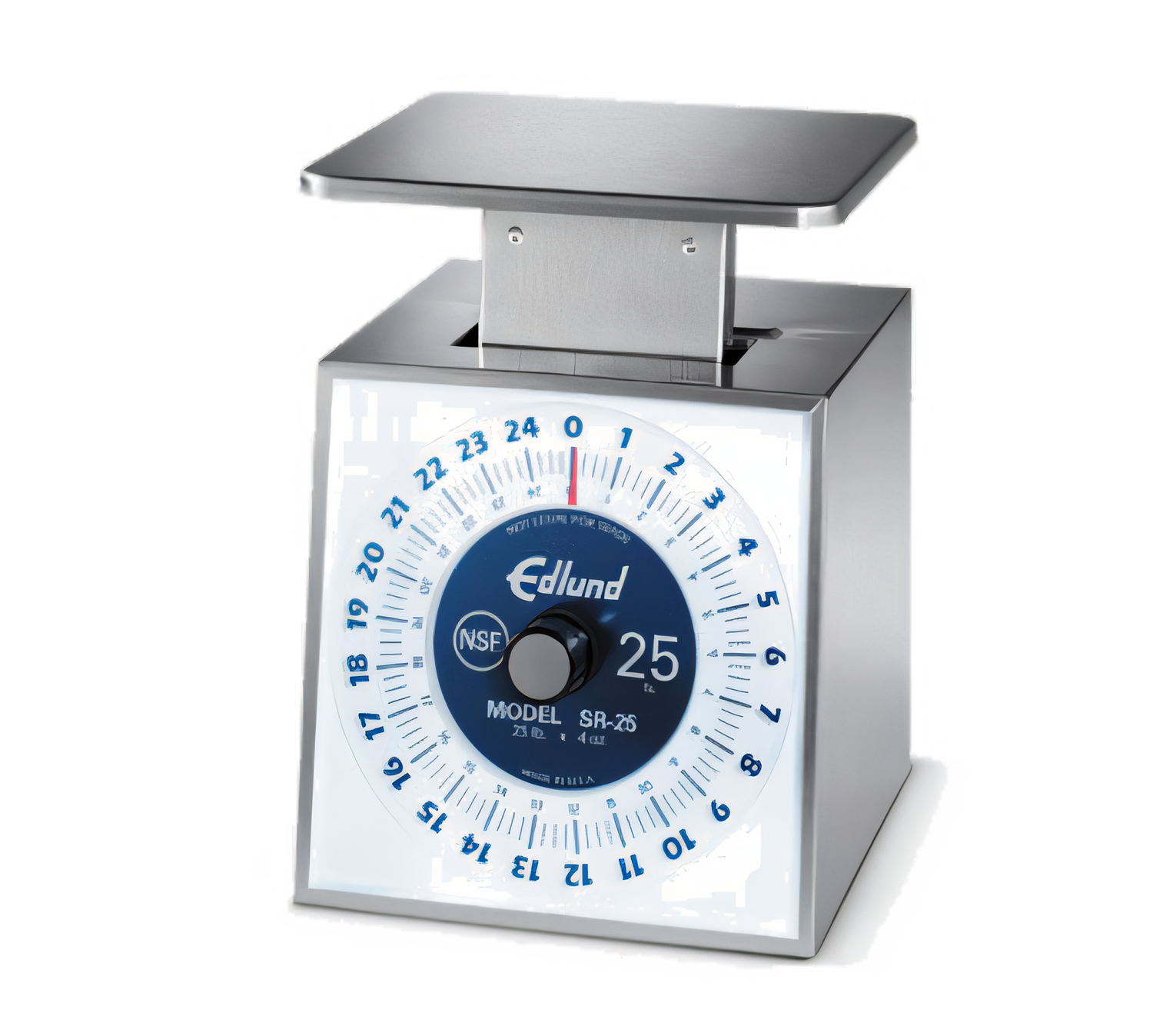 Edlund SR-25 dial portion scale: NSF-certified stainless steel, top-loading, dishwasher-safe, 25 lb x 4 oz accuracy, made in USA.