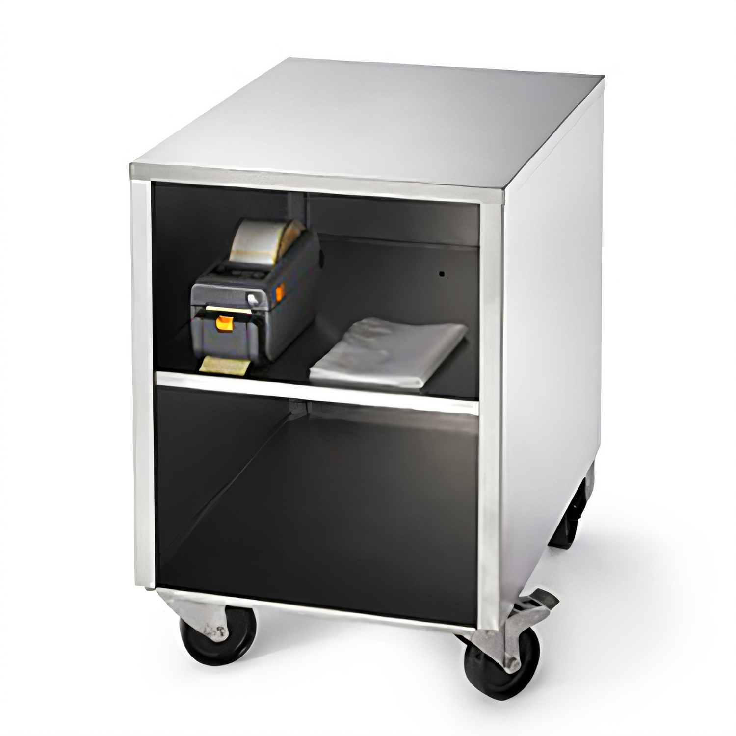 - Two open shelves hold printers, labelers, bags, or spare rolls right where you need them.