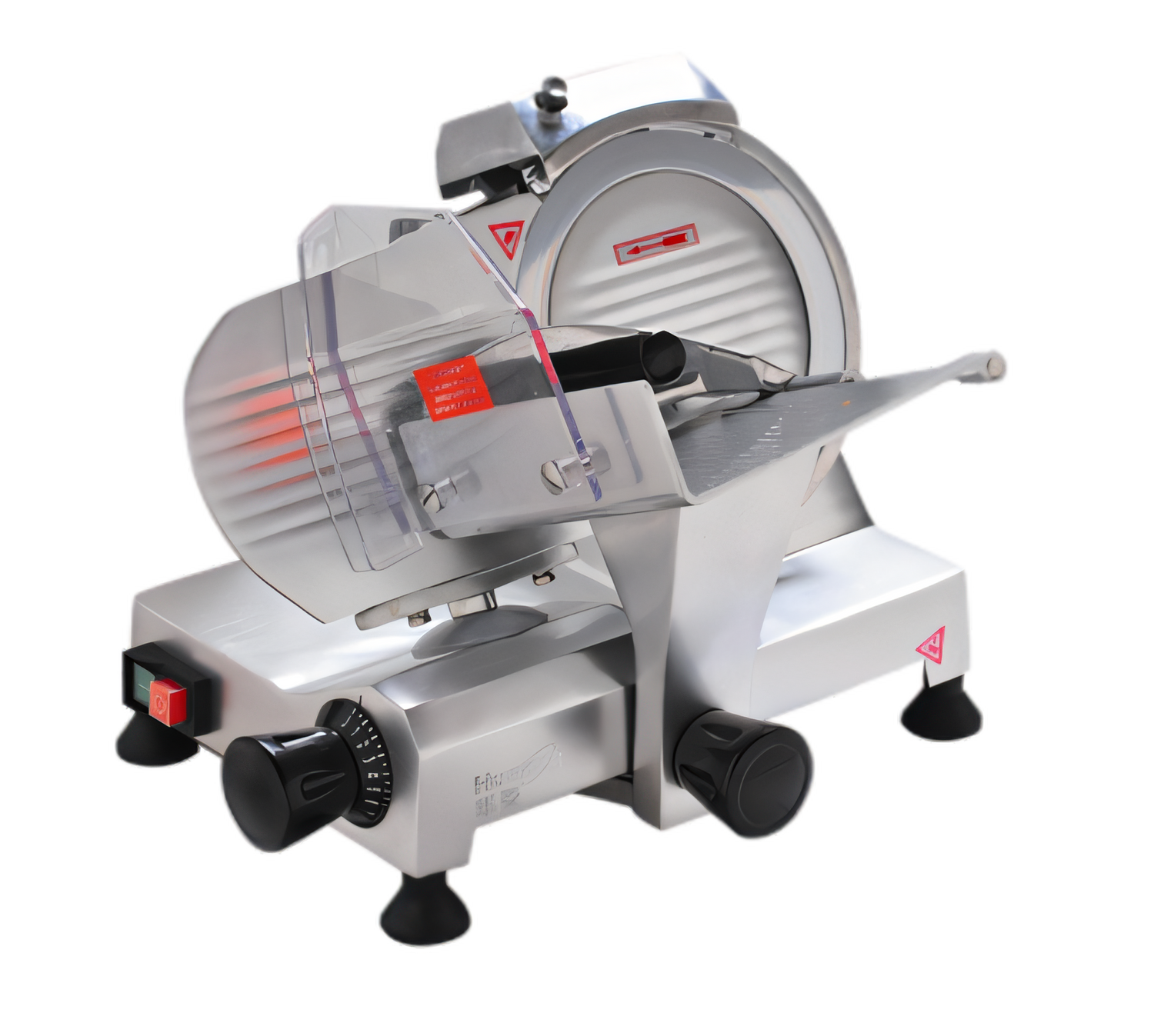 Meat Slicer, 8" blade, blade sharpener, belt drive, Perspex protector guard, waterproof and emergency shut off switch, anodized aluminum, 1.1 amps, 120 watts, 1/6 hp, cETLus, ETL-Sanitation