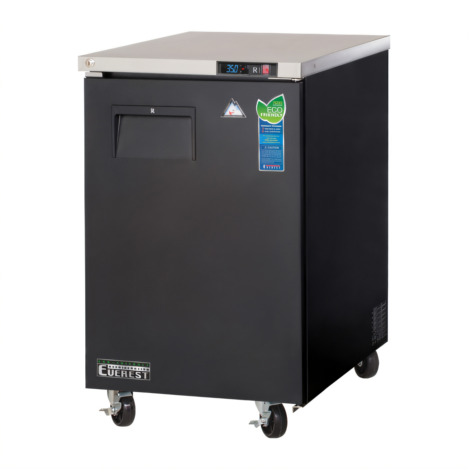 Back Bar Refrigerator, one-section, 23-1/2"W, 8.0 cu. ft. capacity, (220) 12 oz. can or (125) 12 oz. bottle capacity, self-contained rear mounted refrigeration, stainless steel countertop, (1) solid hinged door (locking), (2) epoxy coated wire shelves, digital controls with LED display, auto defrost, LED interior lighting with on/off switch, textured & laminated black vinyl exterior, galvanized steel interior walls & stainless steel floor, (4) 5" swivel casters (2 locking), R290 Hydrocarbon refrigerant, 1/5 HP, 115v/60/1-ph, 2.5 amps, cord, NEMA 5-15P, NSF, cETLus, ETL-Sanitation