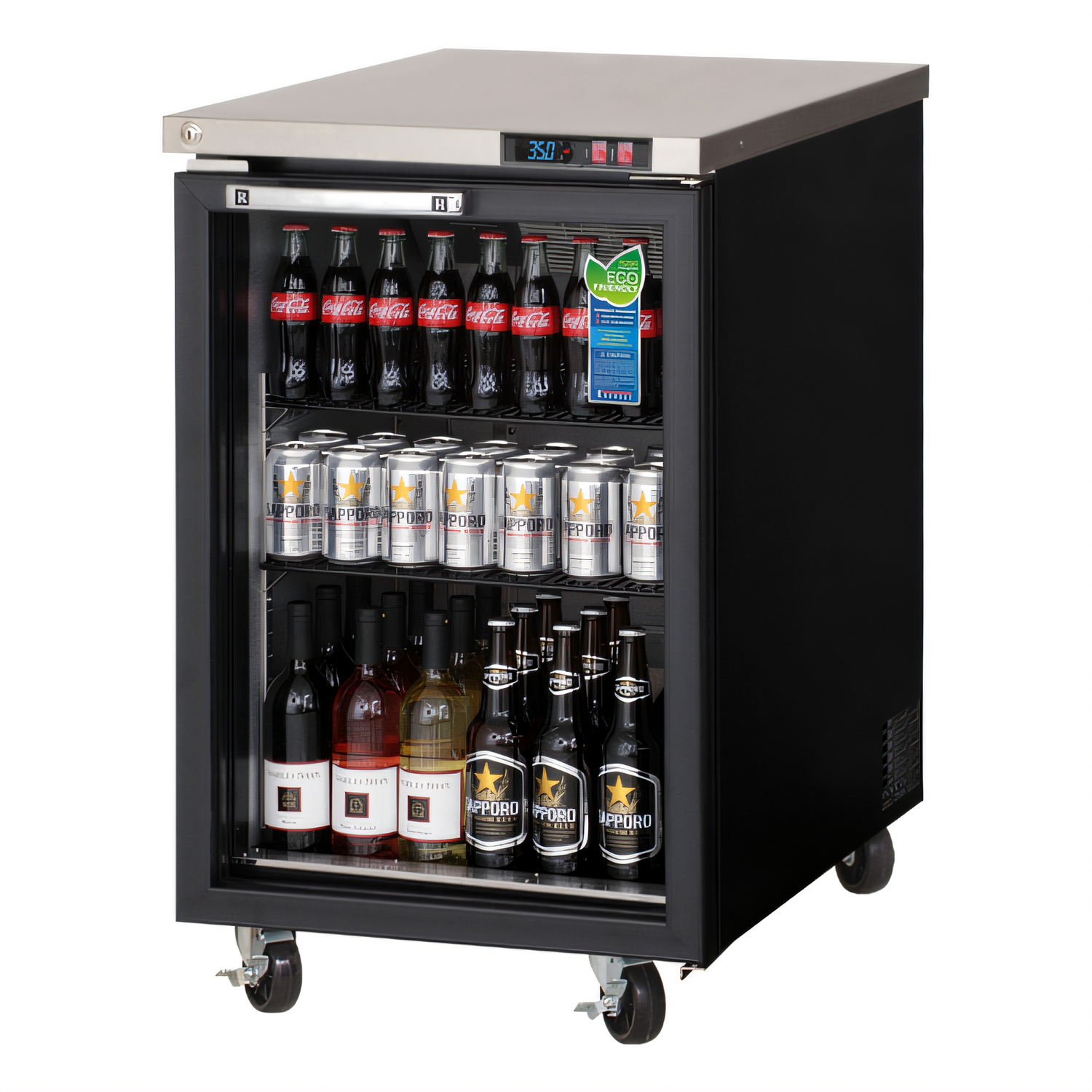 Back Bar Refrigerator, one-section, 23-1/2"W, 8.0 cu. ft. capacity, (220) 12 oz. can or (125) 12 oz. bottle capacity, self-contained rear mounted refrigeration, stainless steel countertop, (1) glass hinged door (locking), (2) epoxy coated wire shelves, digital controls with LED display, auto defrost, LED interior lighting with on/off switch, textured & laminated black vinyl exterior, galvanized steel interior wall & stainless steel floor, (4) 5" swivel casters (2 locking), R290 Hydrocarbon refrigerant, 1/5 HP, 115v/60/1-ph, 2.5 amps, cord, NEMA 5-15P, NSF, cETLus, ETL-Sanitation