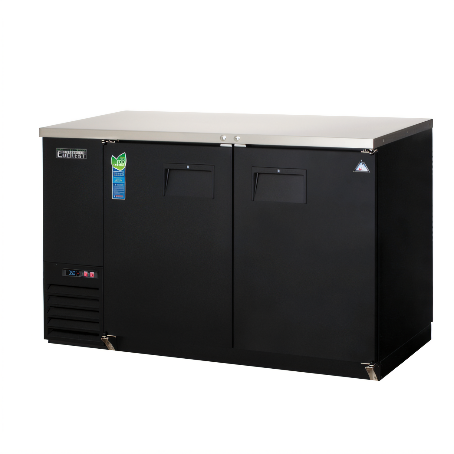Back Bar Refrigerator, two-section, 49"W, 14.0 cu. ft. capacity, (490) 12 oz. can or (344) 12 oz. bottle capacity, self-contained side mounted refrigeration, stainless steel countertop, (2) solid hinged doors (locking), (4) epoxy coated wire shelves, digital controls with LED display, auto defrost, LED interior lighting with on/off switch, textured & laminated black vinyl exterior, galvanized steel interior walls & stainless steel floor, R290 Hydrocarbon refrigerant, 1/4 HP, 115v/60/1-ph, 3.5 amps, cord, NEMA 5-15P, NSF, cETLus, ETL-Sanitation