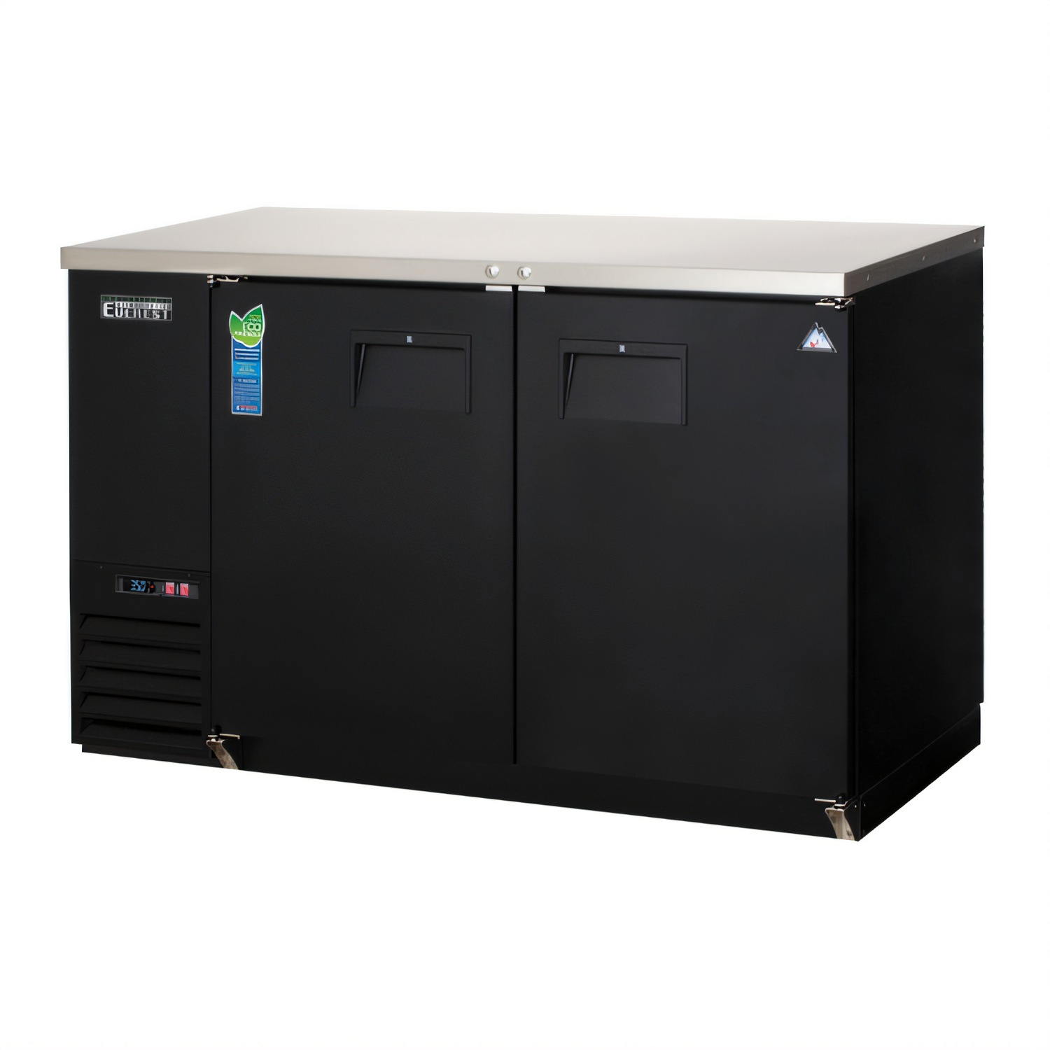 Back Bar Refrigerator, two-section, 57-3/4"W, 17.0 cu. ft. capacity, (560) 12 oz. can or (357) 12 oz. bottle capacity, self-contained side mounted refrigeration, stainless steel countertop, (2) solid hinged doors (locking), (4) epoxy coated wire shelves, digital controls with LED display, auto defrost, LED interior lighting with on/off switch, textured & laminated black vinyl exterior, galvanized steel interior wall & stainless steel floor, R290 Hydrocarbon refrigerant, 1/4 HP, 115v/60/1-ph, 3.5 amps, cord, NEMA 5-15P, NSF, cETLus, ETL-Sanitation