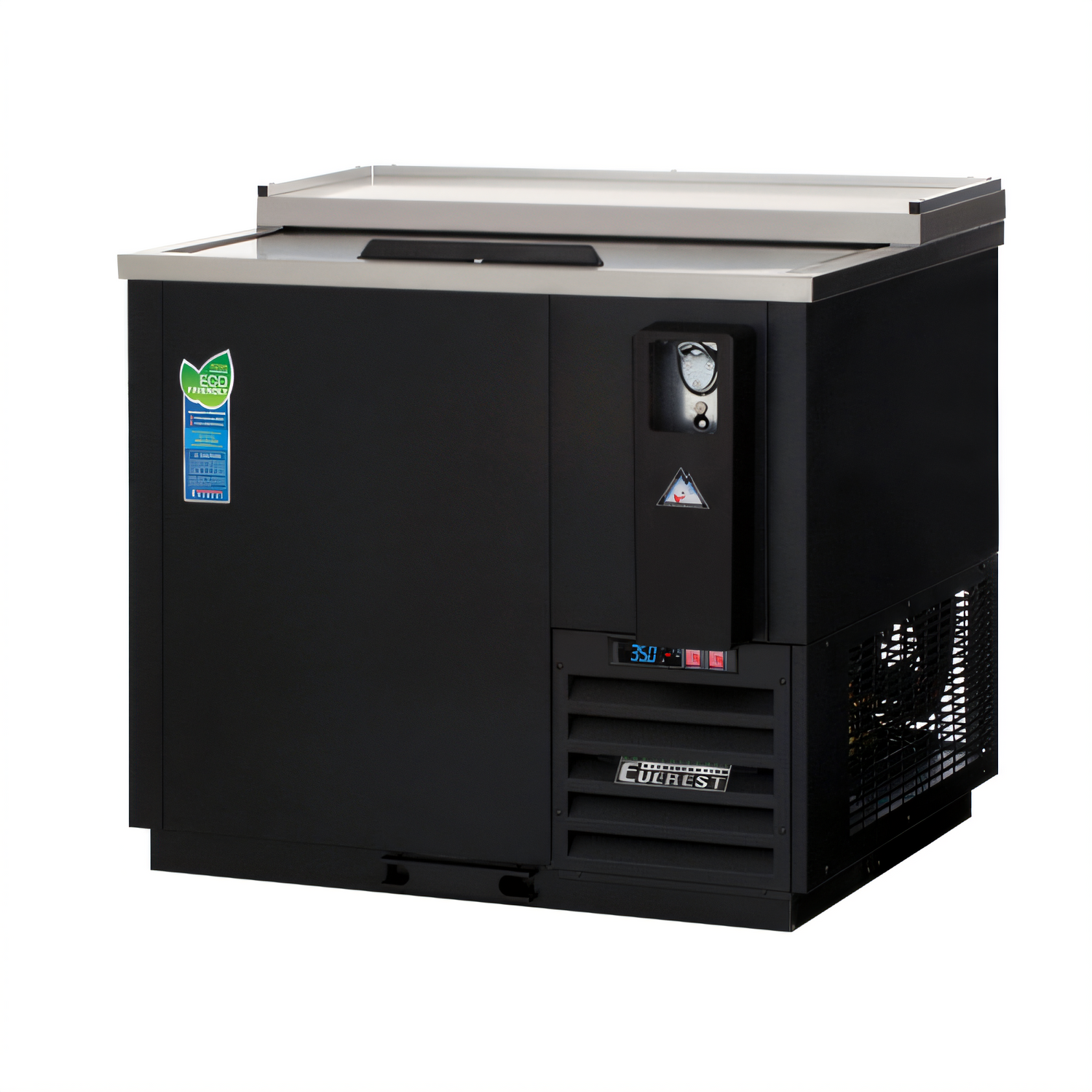 Everest EBC37 horizontal bottle cooler: 11 cu ft, stainless countertop, locking sliding lid, LED interior, digital controls, NSF certified.