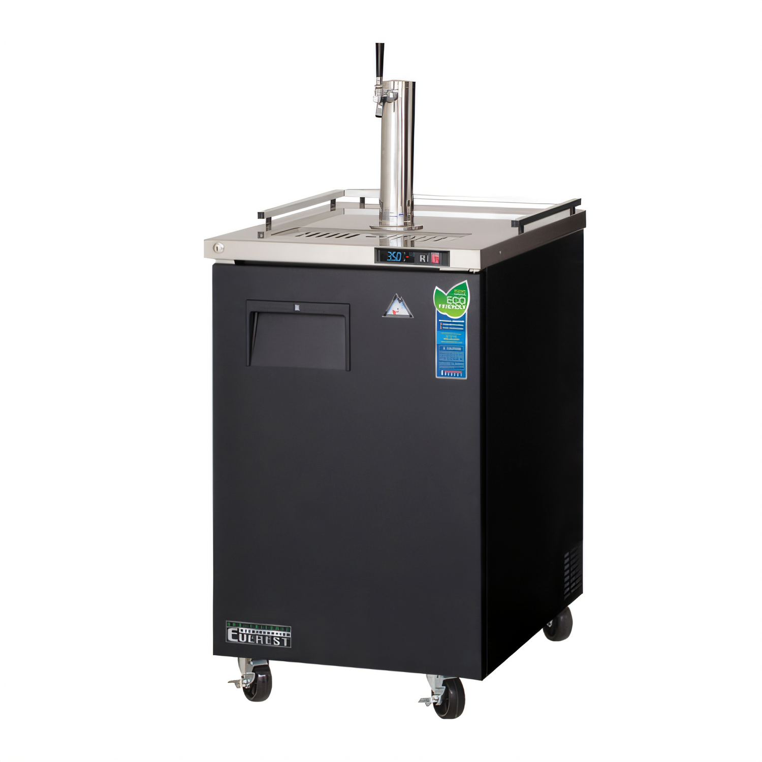 Direct Draw Keg Refrigerator, one-section, 23-1/2"W, 8.0 cu. ft. capacity, self-contained side mounted refrigeration, (1) solid hinged door (locking), holds (1) 1/2 barrel keg, (1) 3" diameter insulated stainless steel draft tower (NSF) with air distributor, (1) single faucet, stainless steel countertop & rail, digital controls with LED display, auto defrost, LED interior lighting, textured & laminated black vinyl exterior, galvanized steel interior wall & stainless steel floor, exterior drain port for excess top tray moisture, drain hose not included, floor drain required, (4) 5" swivel casters (2 locking), R290 Hydrocarbon refrigerant, 1/5 HP, 115v/60/1-ph, 2.5 amps, cord, NEMA 5-15P, NSF, cETLus, ETL-Sanitation