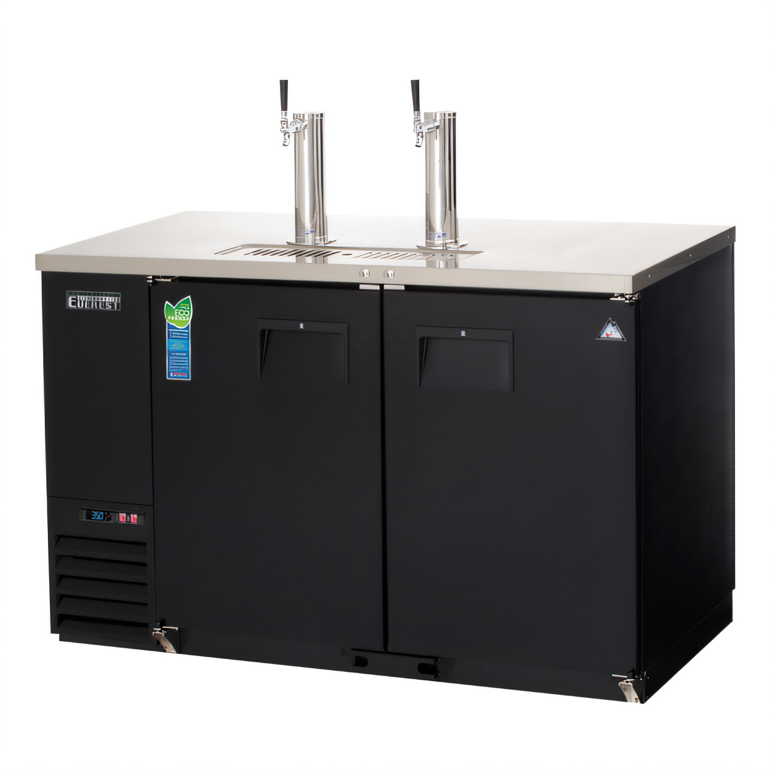 Direct Draw Keg Refrigerator, two-section, 57-3/4"W, 20.0 cu. ft. capacity, self-contained side mounted refrigeration, (2) solid hinged doors (locking), holds (2) 1/2 barrel kegs, (2) 3" diameter insulated stainless steel draft towers (NSF) with air distributor, (1) single faucet per tower, stainless steel countertop, digital controls with LED display, auto defrost, LED interior lighting, textured & laminated black vinyl exterior, galvanized steel interior wall & stainless steel floor, exterior drain port for excess top tray moisture, drain hose not included, floor drain required, R290 Hydrocarbon refrigerant, 1/4 HP, 115v/60/1-ph, 3.5 amps, cord, NEMA 5-15P, NSF, cETLus, ETL-Sanitation