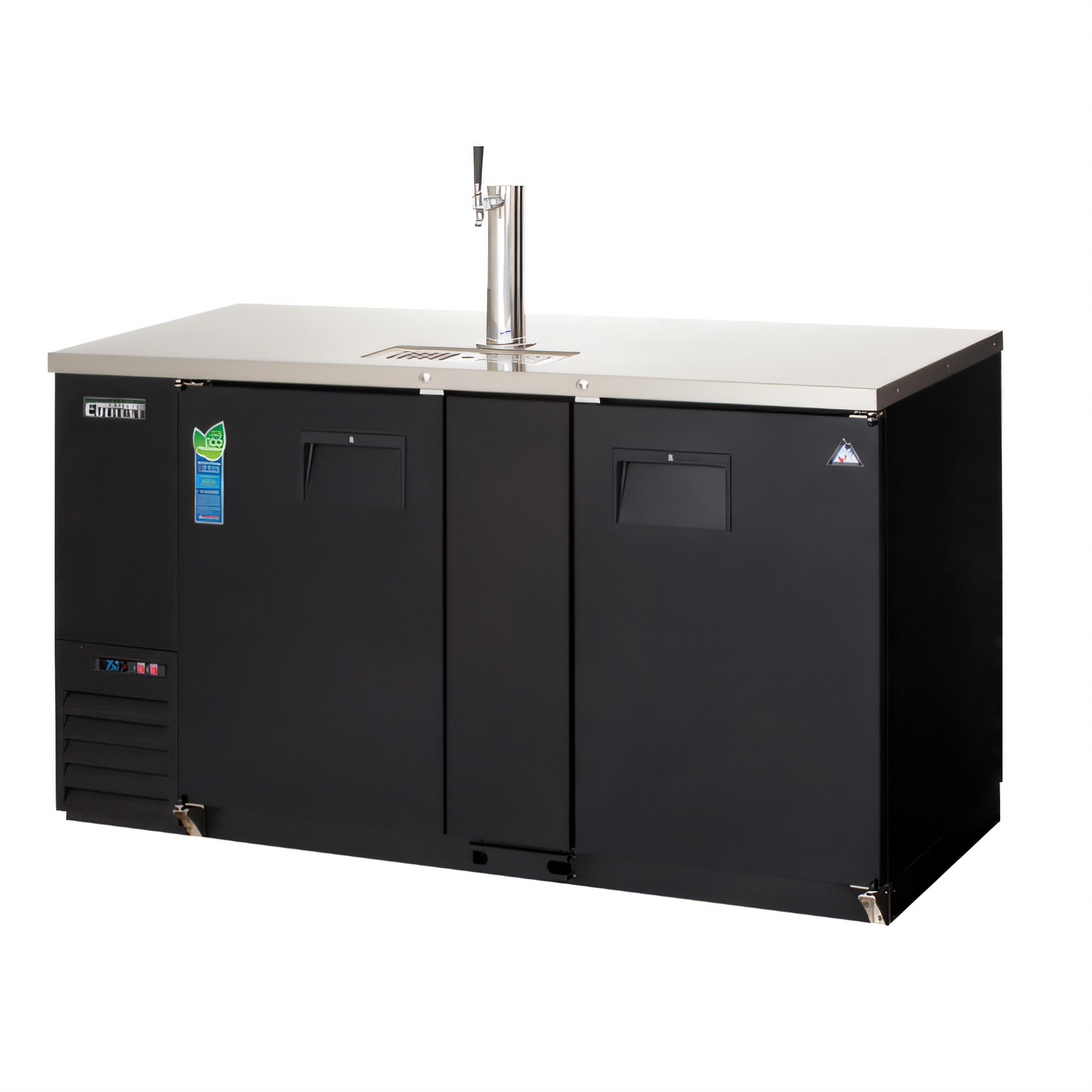 Back Bar & Direct Draw Keg Refrigerator Combo, two-section, 68"W, 20.0 cu. ft. capacity, self-contained side mounted refrigeration, (2) solid hinged doors (locking), holds (1) 1/2 barrel & (1) 1/4 barrel keg, (315) 12 oz. can or (210) 12 oz. bottle capacity, (2) epoxy coated wire shelves, (1) 3" diameter insulated stainless steel draft tower (NSF) with air distributor, single faucet, stainless steel countertop, digital controls with LED display, auto defrost, LED interior lighting with on/off switch, textured & laminated black vinyl exterior, galvanized steel interior wall & stainless steel floor, R290 Hydrocarbon refrigerant, 1/4 HP, 115v/60/1-ph, 3.5 amps, cord, NEMA 5-15P, NSF, cETLus, ETL-Sanitation
