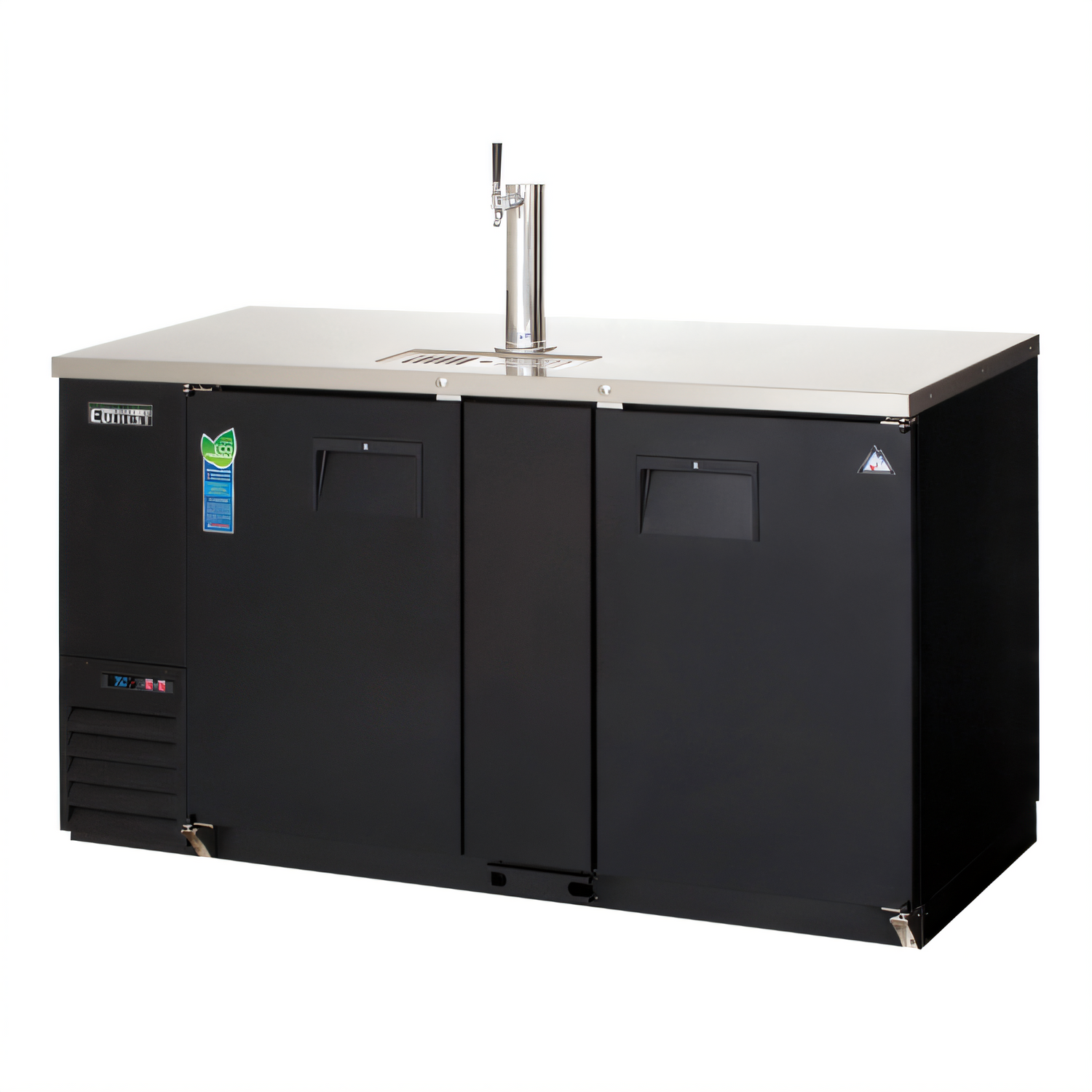 Back Bar & Direct Draw Keg Refrigerator Combo, two-section, 68"W, 24.0 cu. ft. capacity, self-contained side mounted refrigeration, (2) solid hinged doors (locking), holds (1) 1/2 barrel & (1) 1/4 barrel keg, (360) 12 oz. can or (240) 12 oz. bottle capacity, (2) epoxy coated wire shelves, (1) 3" diameter insulated stainless steel draft tower (NSF) with air distributor, single faucet, stainless steel countertop, digital controls with LED display, auto defrost, LED interior lighting with on/off switch, textured & laminated black vinyl exterior, galvanized steel interior wall & stainless steel floor, exterior drain port for excess top tray moisture, drain hose not included, floor drain required, R290 Hydrocarbon refrigerant, 1/4 HP, 115v/60/1-ph, 3.5 amps, cord, NEMA 5-15P, NSF, cETLus, ETL-Sanitation