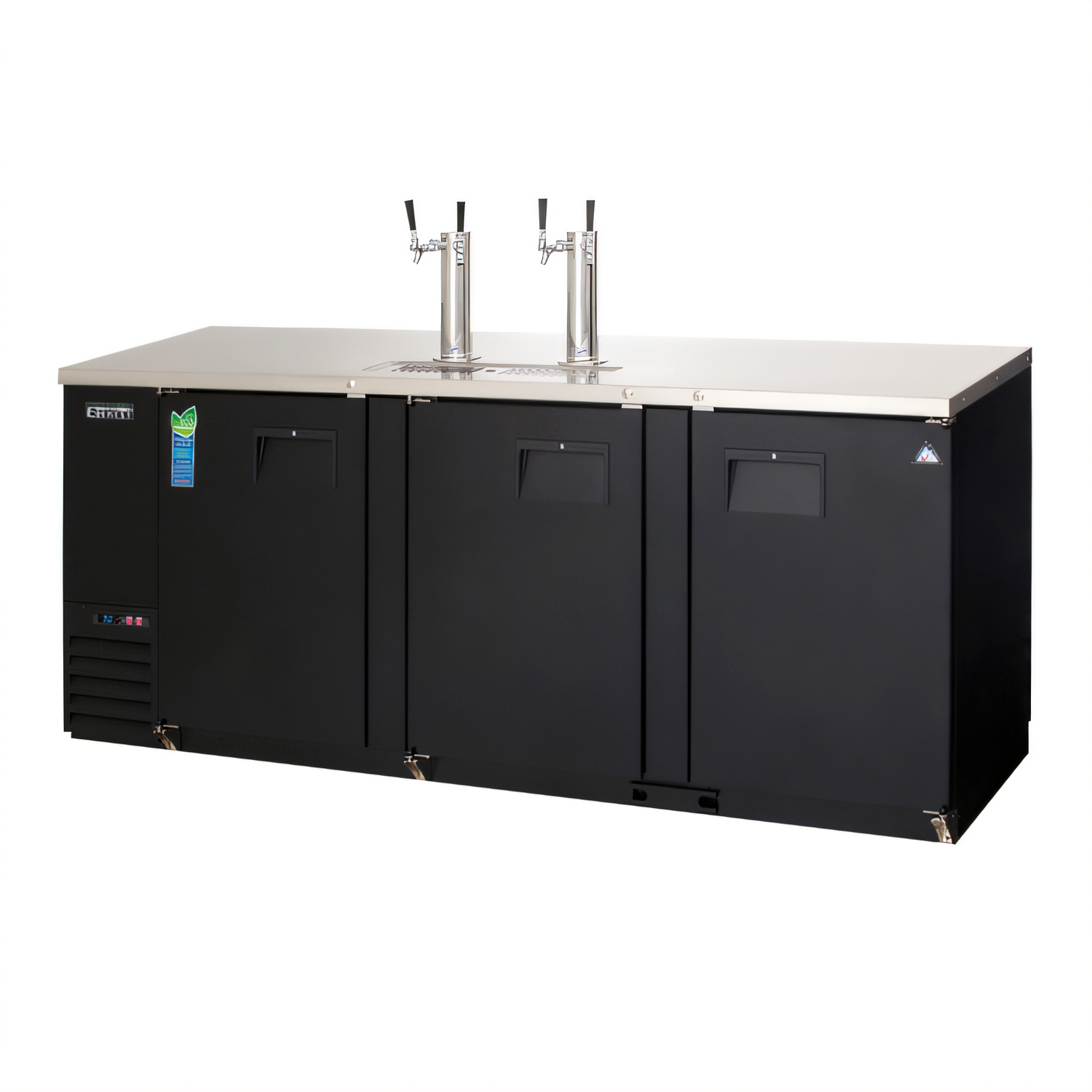 Direct Draw Keg Refrigerator, three-section, 89-1/4"W, 32.0 cu. ft. capacity, self-contained side mounted refrigeration, (3) solid hinged doors (locking), holds (4) 1/2 barrel kegs, (2) 3" diameter insulated stainless steel draft towers (NSF) with air distributor, (2) faucets per tower, stainless steel countertop, digital controls with LED display, auto defrost, LED interior lighting, textured & laminated black vinyl exterior, galvanized steel interior wall & stainless steel floor, exterior drain port for excess top tray moisture, drain hose not included, floor drain required, R290 Hydrocarbon refrigerant, 1/3 HP, 115v/60/1-ph, 2.5 amps, cord, NEMA 5-15P, NSF, cETLus, ETL-Sanitation