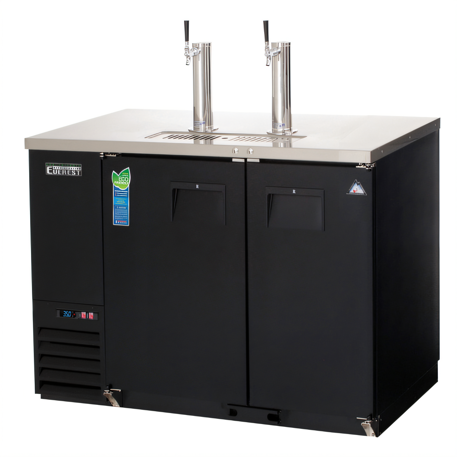 Direct Draw Keg Refrigerator, two-section, 49"W, 13.0 cu. ft. capacity, self-contained side mounted refrigeration, (2) solid hinged doors (locking), holds (1) 1/2 barrel & (1) 1/4 barrel keg, (2) 3" diameter insulated stainless steel draft towers (NSF) with air distributor, (1) faucet per tower, stainless steel countertop, digital controls with LED display, auto defrost, LED interior lighting, textured & laminated black vinyl exterior, galvanized steel interior wall & stainless steel floor, exterior drain port for excess top tray moisture, drain hose not included, floor drain required, R290 Hydrocarbon refrigerant, 1/4 HP, 115v/60/1-ph, 3.5 amps, cord, NEMA 5-15P, NSF, cETLus, ETL-Sanitation