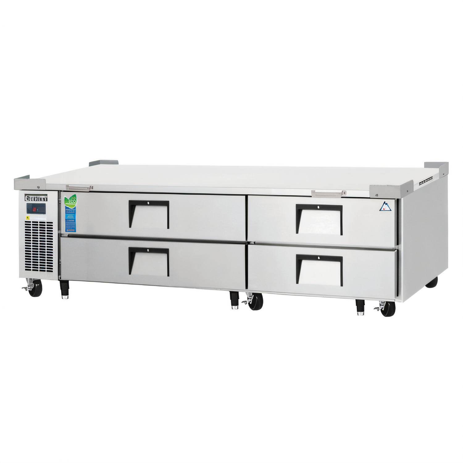 Chef Base Refrigerator, two-section, 84"W, self-contained side mounted refrigeration, (4) heavy duty stainless steel drawers, 1,084 lbs. weight capacity, 16 gauge stainless steel worktop, digital controls with LED display, auto defrost, dual air chamber & vents, high heat insulation, stainless steel grips, worktop security corner guards, stainless steel interior & exterior, galvanized steel bottom & rear, (3) leg stabilizers, (6) 5" swivel casters (3 locking), R290 Hydrocarbon refrigerant, 1/3 HP, 115v/60/1-ph, 2.0 amps, cord, NEMA 5-15P, NSF, cETLus, ETL-Sanitation