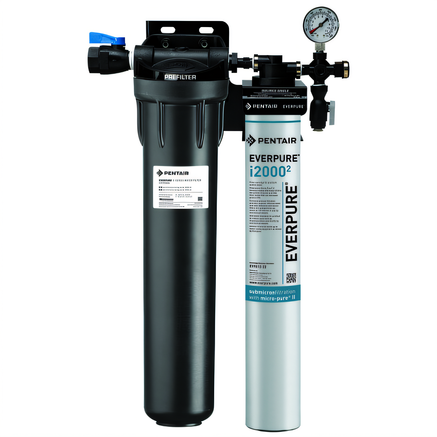 Insurice® Water Filtration System, Insurice® Single PF-i2000², Single, (1) EC210 Prefilter, (1) i2000² Micro-Pure® II Precoat primary filtration cartridge, reduces chlorine, taste & odor, inhibits scale, outlet pressure gauge, flushing valve, 9,000 gallons, 1.67 gpm, 0.5 micron, 3/4" inlet, 3/8" outlet, NSF 42 & 53 (EV932421)