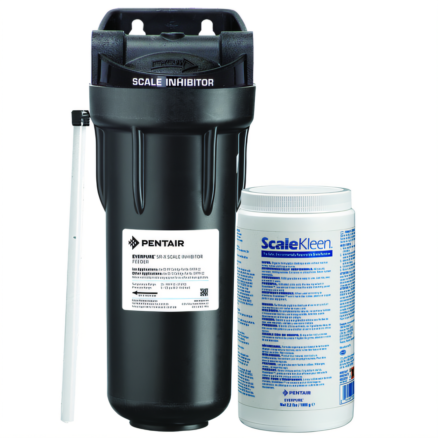 SR-X Feeder and Deliming System, (1) Everpure® SR-X Scale Inhibitor, (1) SR-X Housing, (1) SS-10 scale reduction cartridge, dip tube, 2.2 lb. Pentair Everpure® ScaleKleen package, 6.0 gpm, 3/4" inlet, 3/4" outlet, NSF 42 (EV979720)