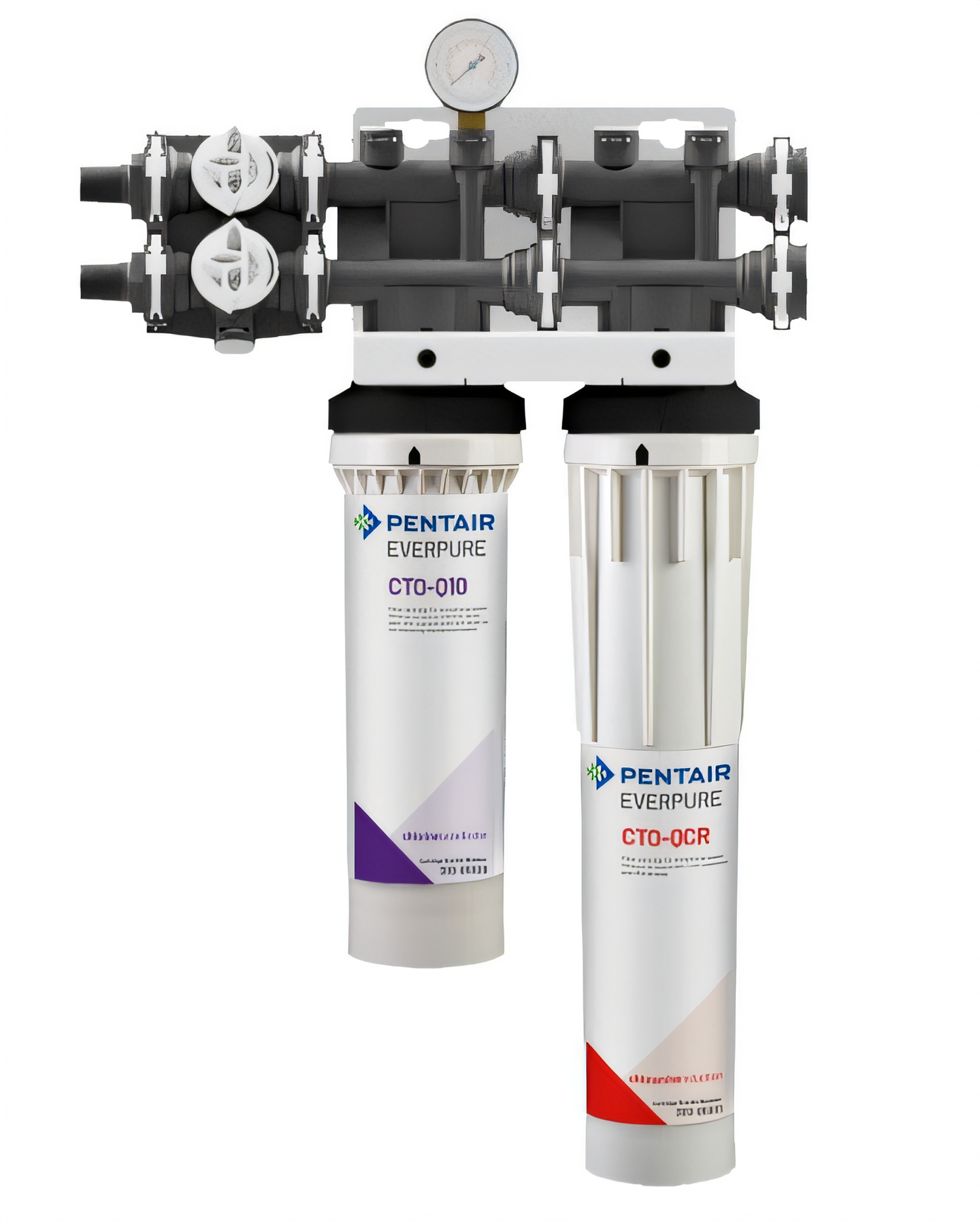 QT1+CR Water Filter System, Single, (1) CTO-Q10 activated carbon cartridge, reduces chlorine & sediment, (1) CTO-QCR catalytic carbon cartridge, reduces chloramine, outlet pressure gauge, water shut-off valve, bypass valve, mounting bracket, 20,000 gallons, 2.5 gpm, 3/4" inlet, 3/4" outlet, NSF 42 (170-52090)