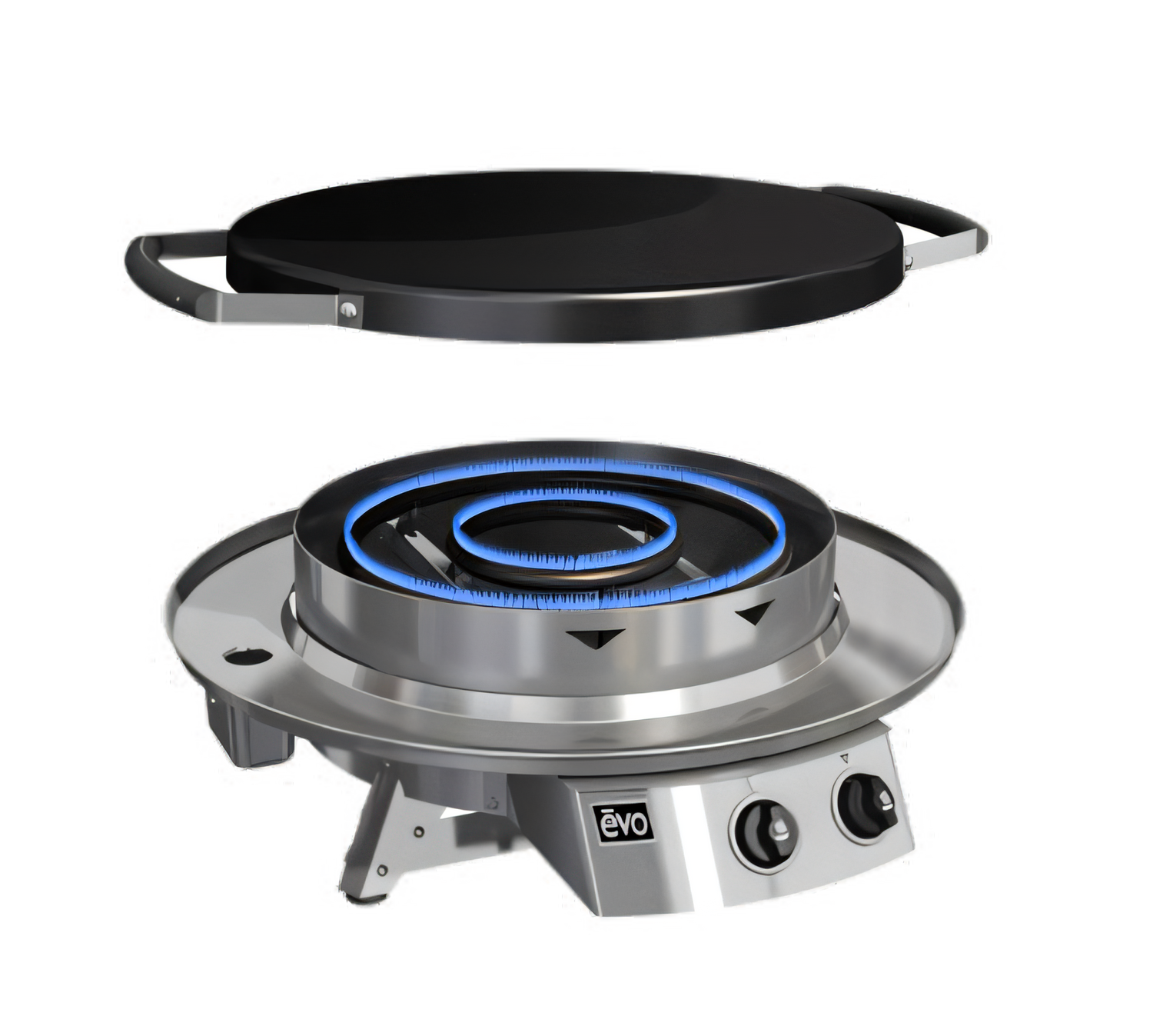 (QUICK SHIP) Evo® Professional Commercial Series Cooking Station, propane, countertop, outdoor use, 30" diameter black seasoned steel removable cooking surface (plancha), 2 round inner & outer temperature zones, temperature range: 220°-550° F (121°-288° C), separate control knobs for inner & outer burners, electric push button ignition, heat shield, quick release removable stainless steel drip pan & burners, stackable, includes: cleaning kit, (2) stainless steel spatulas, (1) stainless steel scraper, 48,000 BTU, NSF, CE, Made in USA (fully assembled) (Ships within 1-2 days)