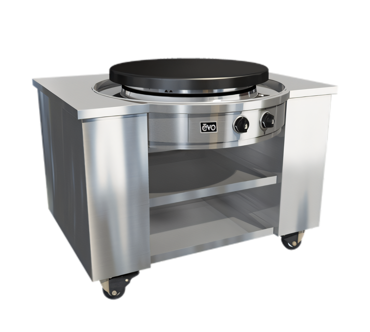 Evo® Affinity 30G DCS Commercial Series Freestanding Cooking Station, natural gas, outdoor use, 30" diameter black seasoned steel cooking surface (plancha), 2 round inner & outer temperature zones, temperature range: 225°-550° F (121°-288° C), separate control knobs for inner & outer burners, electronic push button ignition, 2 open shelves, stainless steel, includes: cleaning kit, (2) stainless steel spatulas, (1) stainless steel scraper, 36,267 BTU, NSF, Made in USA