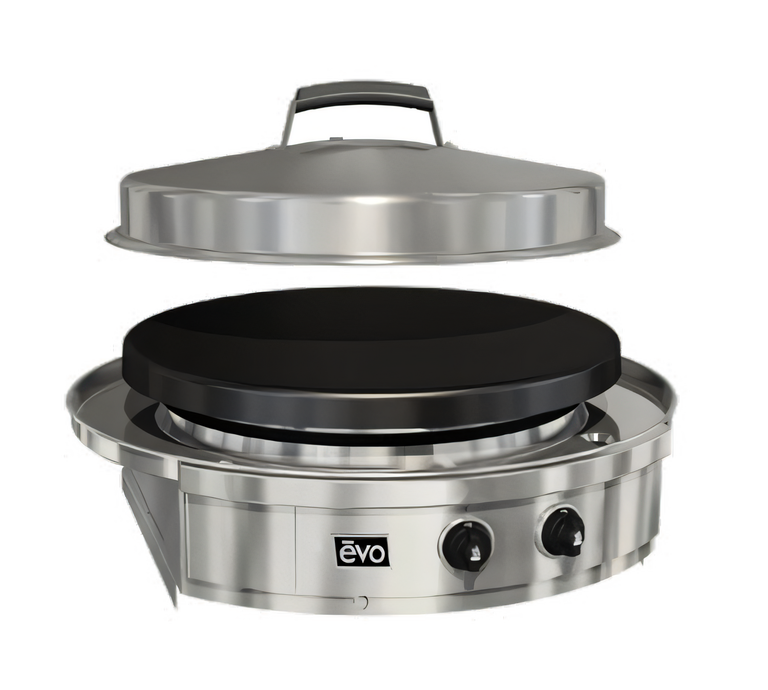 Evo® Affinity 30G Commercial Series Drop-In Cooktop, natural gas, outdoor use, 30" diameter black seasoned steel cooking surface (plancha), (2) round inner & outer temperature zones, temperature range: 225°-550° F (121°-288° C), separate control knobs for inner & outer stainless steel burners, electronic push button ignition, can be mounted, stainless steel drip pan, spill collection tray, includes: cleaning kit, (2) stainless steel spatulas, (1) stainless steel scraper, 36,267 BTU, NSF