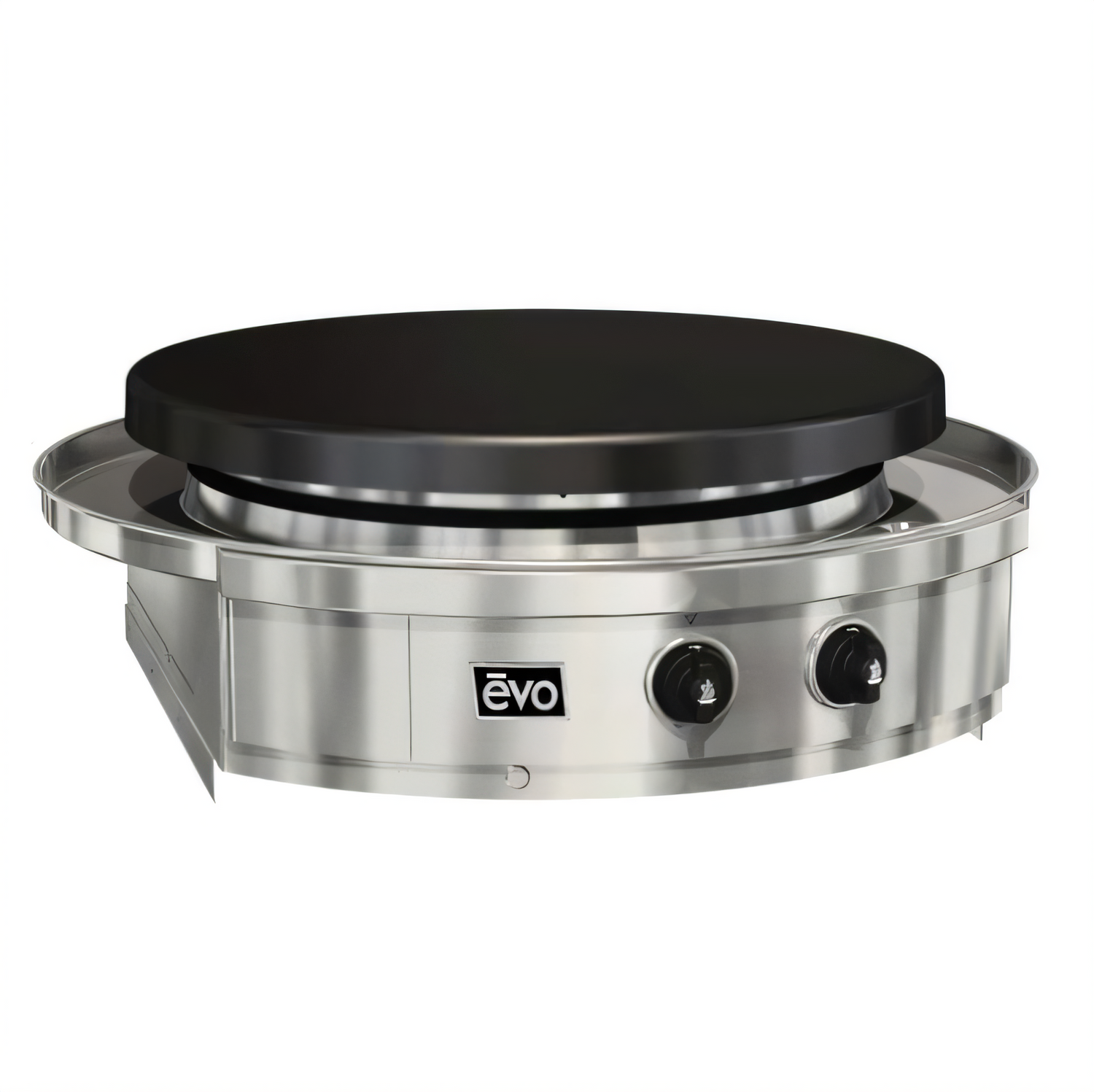 Evo® Affinity 30Gp Commercial Series Drop-In Cooktop, natural gas, indoor use, 30" diameter black seasoned steel cook surface (plancha), (2) round inner & outer temperature zones with separate control knobs, temperature range: 225°-525° F (121°-274° C), stainless steel drip pan, spill collection tray, can be mounted, includes: cleaning kit, (2) stainless steel spatulas, (1) stainless steel scraper, 36,267 BTU, standing gas pilot light, NSF, Made in USA