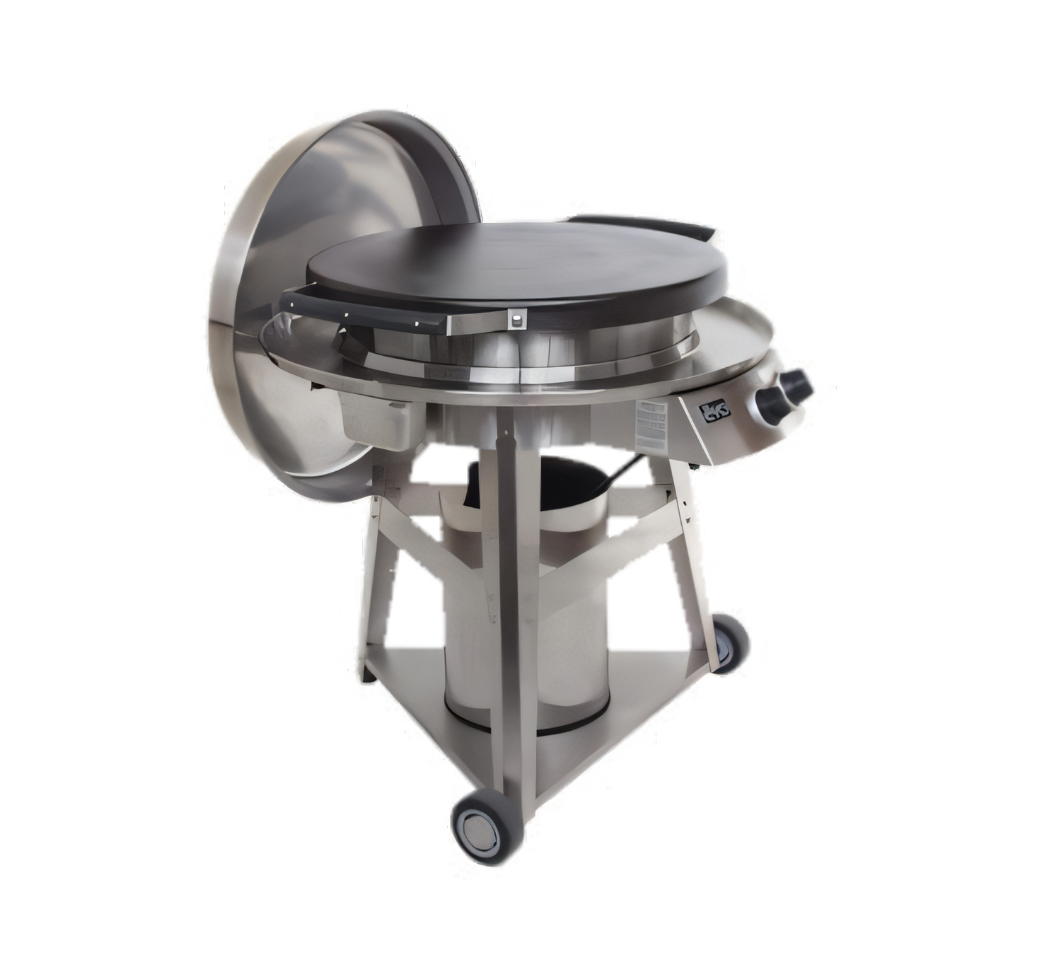(QUICK SHIP) Evo® Professional Commercial Series Cooking Station, propane, outdoor use, 30" diameter black seasoned steel removable cooking surface (plancha), (2) round inner & outer temperature zones, temperature range: 225°-550° F (121°-288° C), separate control knobs for inner & outer burners, electronic push button ignition, on wheeled cart with rear handle, stainless steel tank sleeve, quick release stainless steel drip pan, side mounted spill collection tray, includes: cleaning kit, (2) stainless steel spatulas, (1) stainless steel scraper, 48,000 BTU, NSF, CE, Made in USA (Ships within 1-2 days)