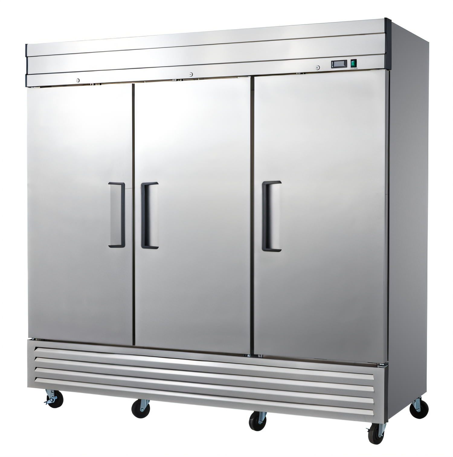 Freezer, reach-in, three-section, 81-1/8"W, 65.5 cu. ft. capacity, bottom mount self-contained refrigeration, (3) hinged solid doors (locking), (9) adjustable coated wire shelves, digital temperature control with display, interior LED lighting, automatic defrost, pre-coated aluminum interior with stainless steel floor, stainless steel exterior, R290 Hydrocarbon refrigerant, 1 hp, 115v/60/1-ph, cETLus, ETL-Sanitation, DOE 2017 compliant ******NORMALLY STOCKED IN RENO, NV 89502 AND Plant City, FL 33565**********