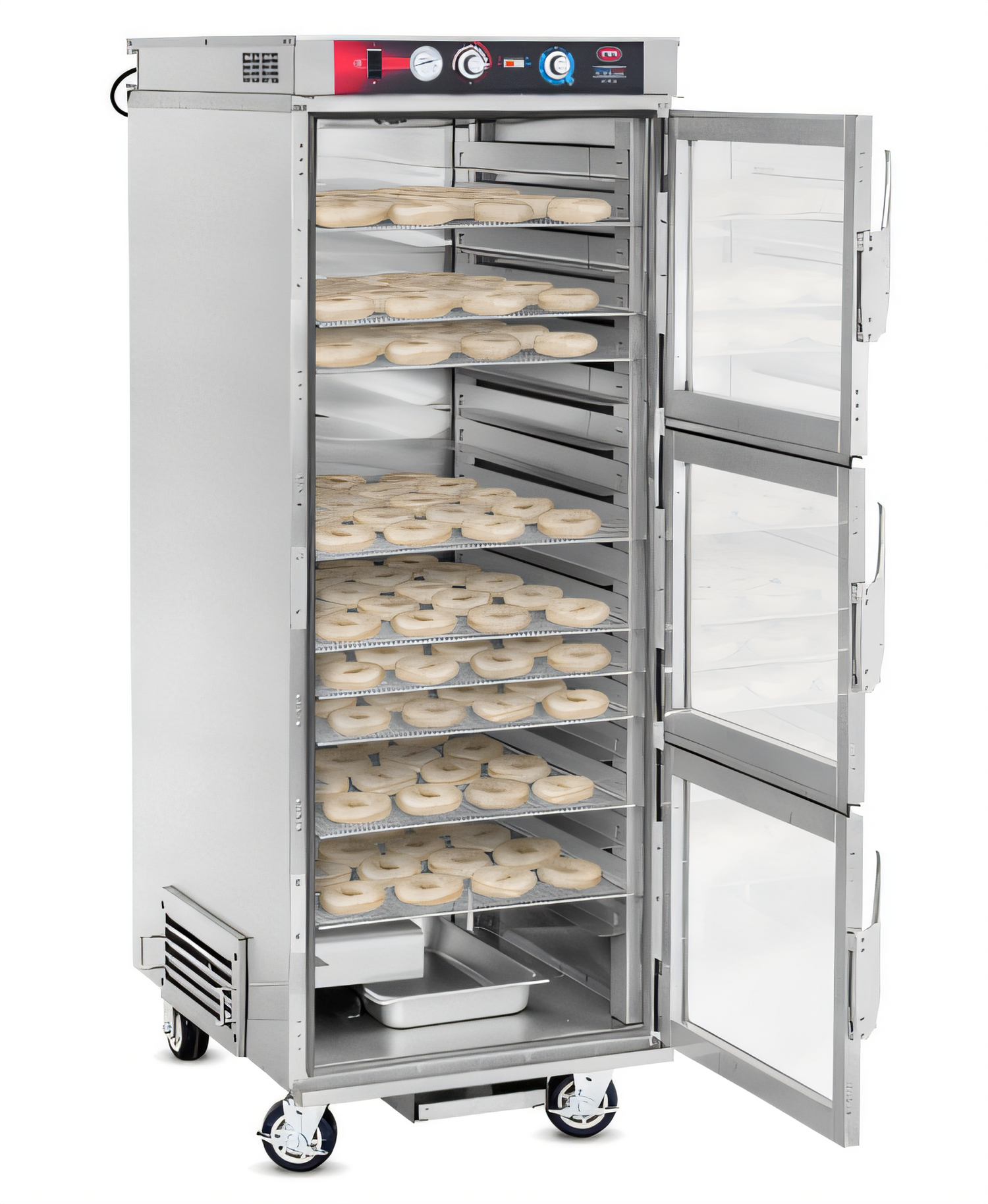 Proofer/Heater Cabinet, removable stainless steel tray rack with fixed 3' OC, for (18) donut screens either 23"X33" or 23"X23", humidified proofer/heating system, adjustable thermostat, separate controls, non-insulated cabinet, (1) see thru lexan door, removable water reservoir, stainless steel interior & exterior, 5' casters (2) rigid & (2) swivel with brakes, UL, cUL, NSF