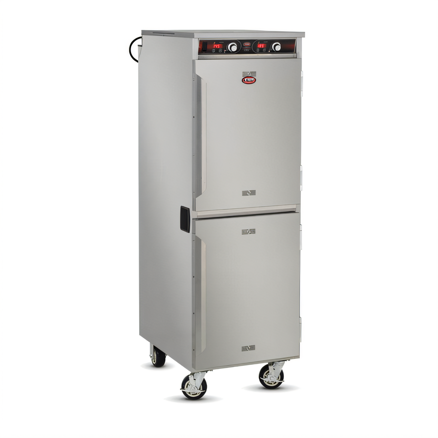 Handy Line Heated Cabinet, mobile, split cavity, (16) 18" x 26" or (32) 14" x 18" pan capacity, standard fixed rack on 3" centers, radiant heating system, adjustable thermostat, separate front controls, insulated, (2) flush mounted doors, stainless steel interior & exterior, 5" casters (2) rigid & (2) swivel with brakes, UL, cUL, ANSI NSF 4, IPX4