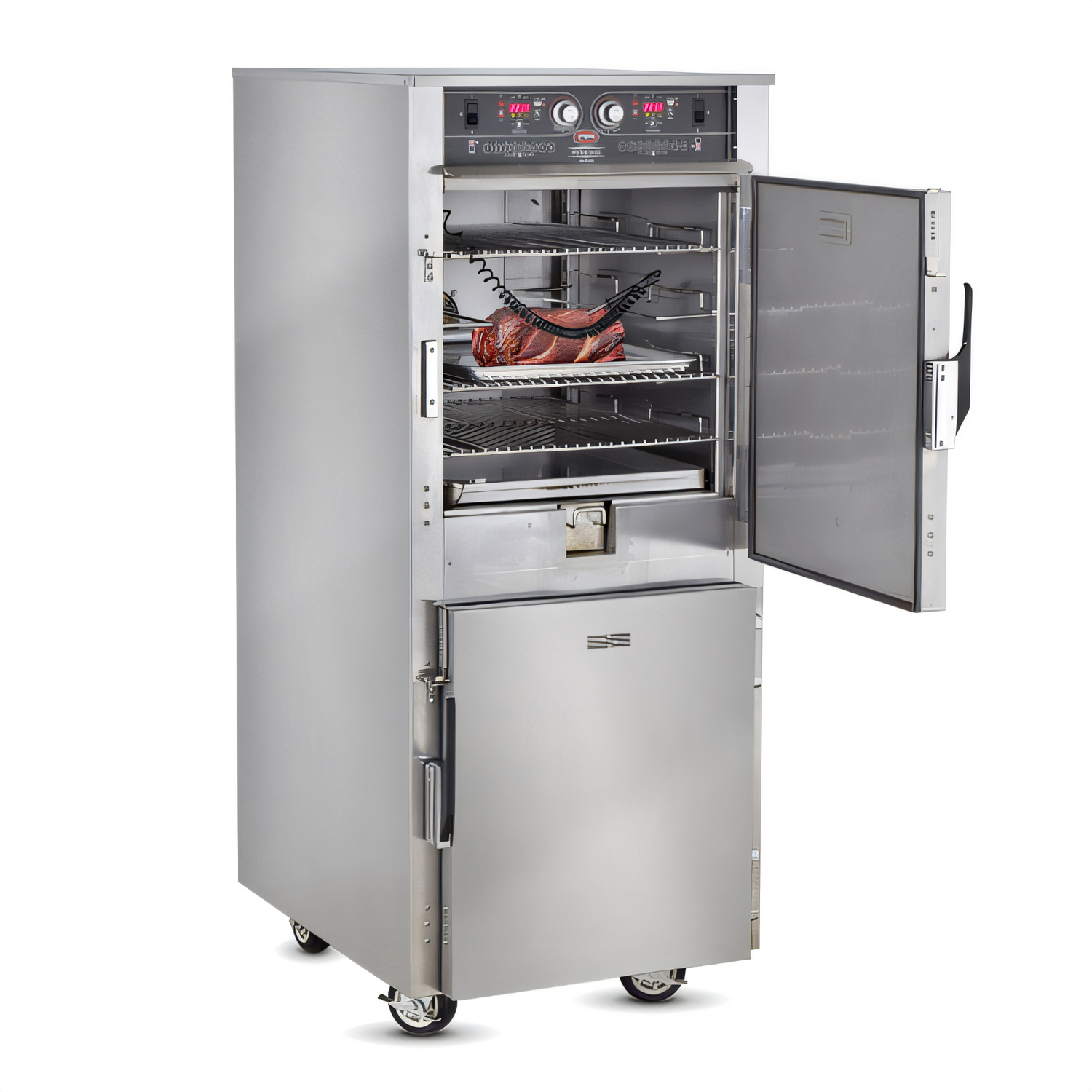 Mobile low-temp cook & hold smoker oven with adjustable trays, LED controls, insulated stainless steel build, up to 350°F, UL-listed