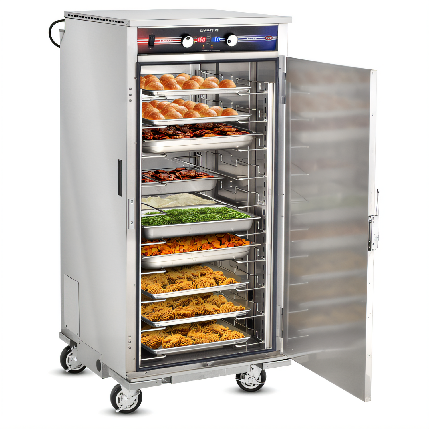 Clymate IQ® Heated Cabinet, with controlled venting mobile, (10) pair universal tray slides, (10) 18" x 26" or (20) 12" x 20" tray capacity, 4-1/2" OC, adjustable to 1-1/2" increments, humidified holding system, individual heat & humidity controls, insulated, removable water reservoir, (1) flush mounted door, recessed hand grips, stainless steel interior & exterior, 5" casters, (2) rigid & (2) swivel with brakes, cULus, UL EPH Classified, IPX4
