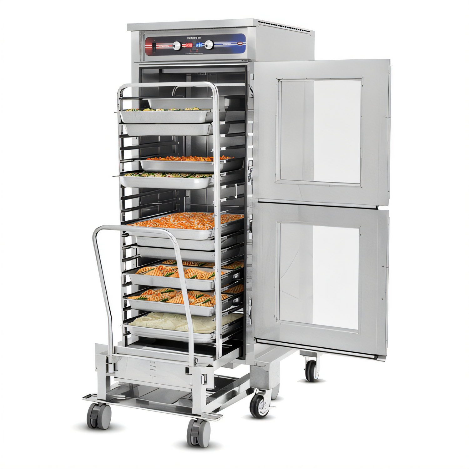 Mobile Clymate IQ heated holding cabinet for combi racks: adjustable temp/humidity, stainless steel, casters, safety-rated.
