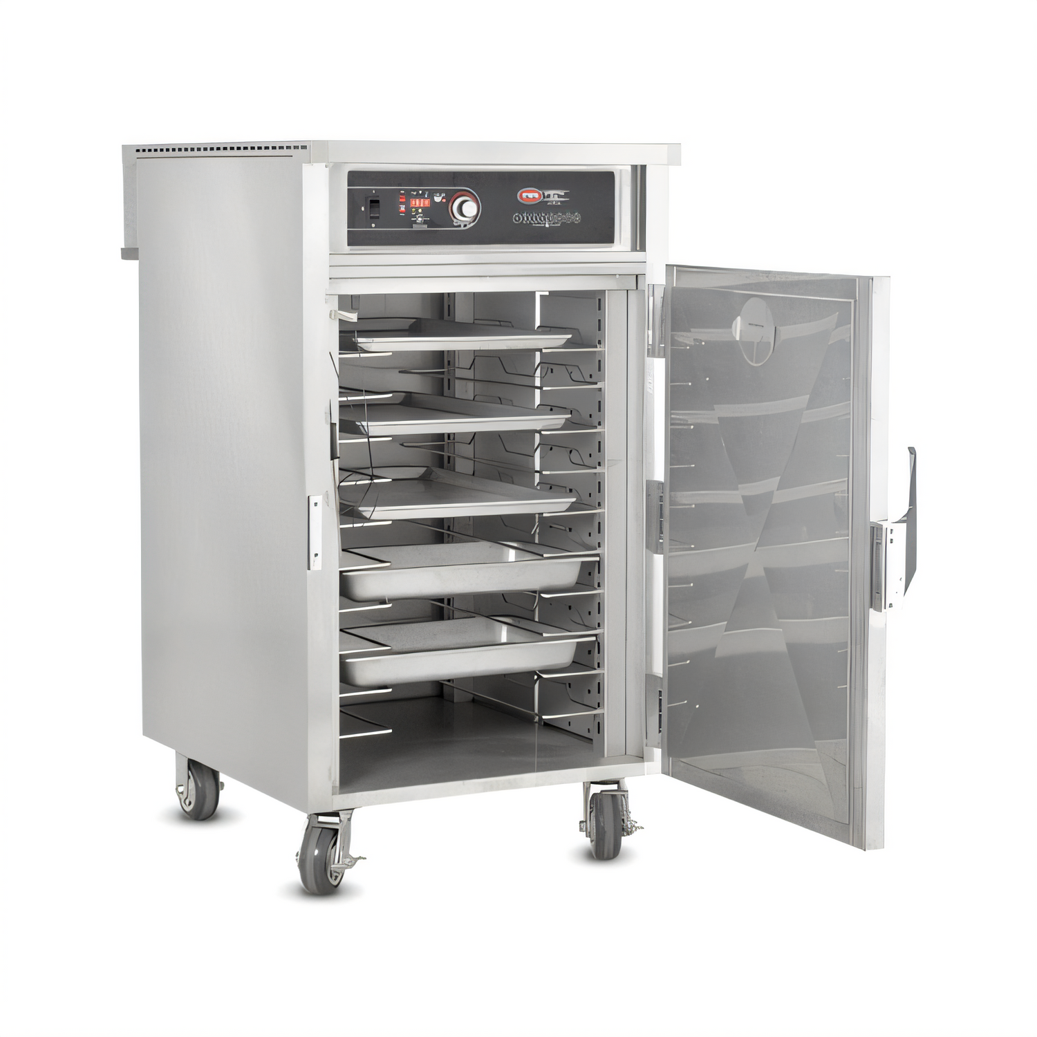 High Output Rethermalization & Holding Cabinet, electric, mobile, (10) 18" x 26" trays/baskets or (20) 12" x 20" x 2.5 pans capacity, 3" OC, adjustable to 1-1/2" increments, dual-cycle, automatic controls, heating temperature up to 340° F, holding temperature up to 190° F, digital display, insulated, (1) flush mounted door, stainless steel construction, 5" casters (2) rigid & (2) swivel with brakes, cULus, UL EPH Classified