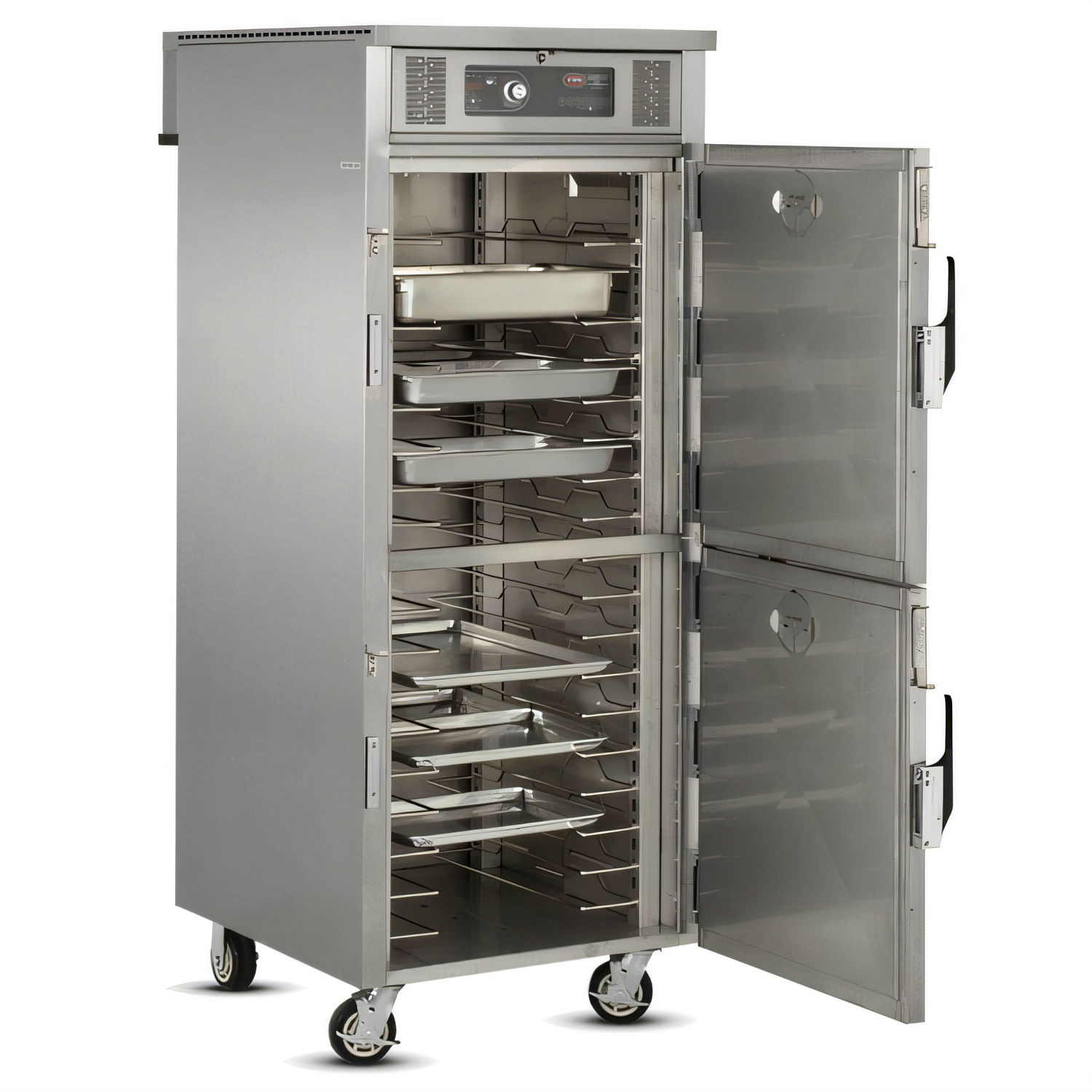 Rethermalization & Holding Cabinet, electric, mobile, (18) 18" x 26" trays/baskets or (36) 12" x 20" x 2-1/2 pans capacity, 3" OC spacing adjustable to 1-1/2" increments, dual-cycle, automatic controls, heating temperature up to 340° F, holding temperature up to 190° F, digital display, insulated, (2) dutch doors, stainless steel construction, 5" casters (2) rigid & (2) swivel with brakes, cULus, UL EPH Classified
