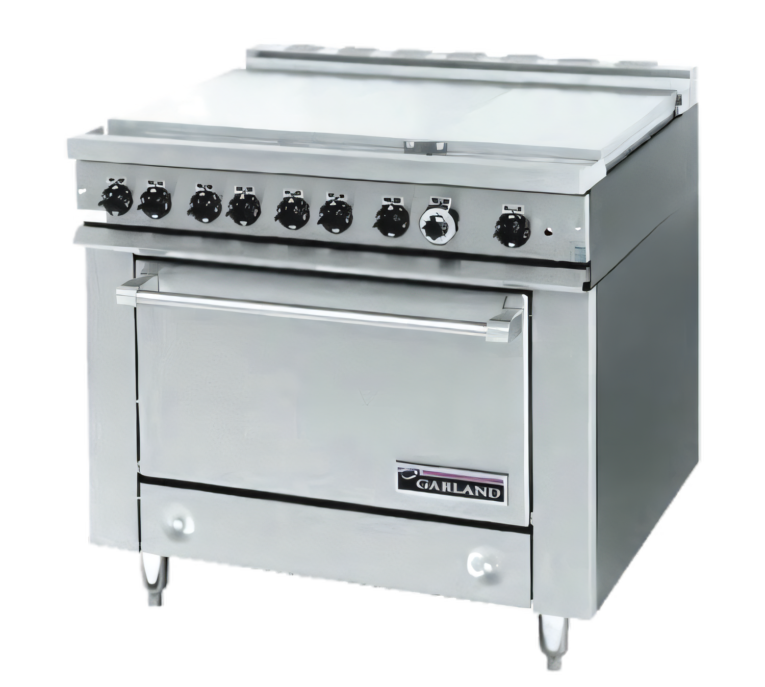 Model 36ER39 • 6 Heat Zones • Standard Oven • 18.5 kWBuilt for high-volume production, the Garland 36ER39 combines an ultra-rugged boiling plate top with a full-size oven, giving chefs the versatility to simmer, sear, sauté and bake from a single 36-inch footprint.