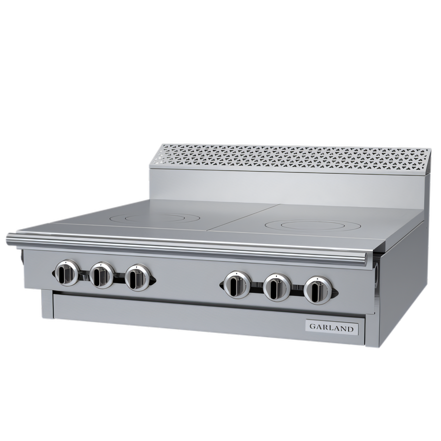 Model C36-10M | 75,000 BTU | Natural or Propane GasDesigned for the punishing pace of today’s professional kitchens, the Garland Cuisine Series C36-10M packs two powerful 18" front-fired hot tops into a rugged 36" frame. With a total of 75,000 BTU, removable cast-iron lids and rings, and all-stainless exteriors, this range top delivers the even heat, flexibility and durability chefs demand—shift after shift.