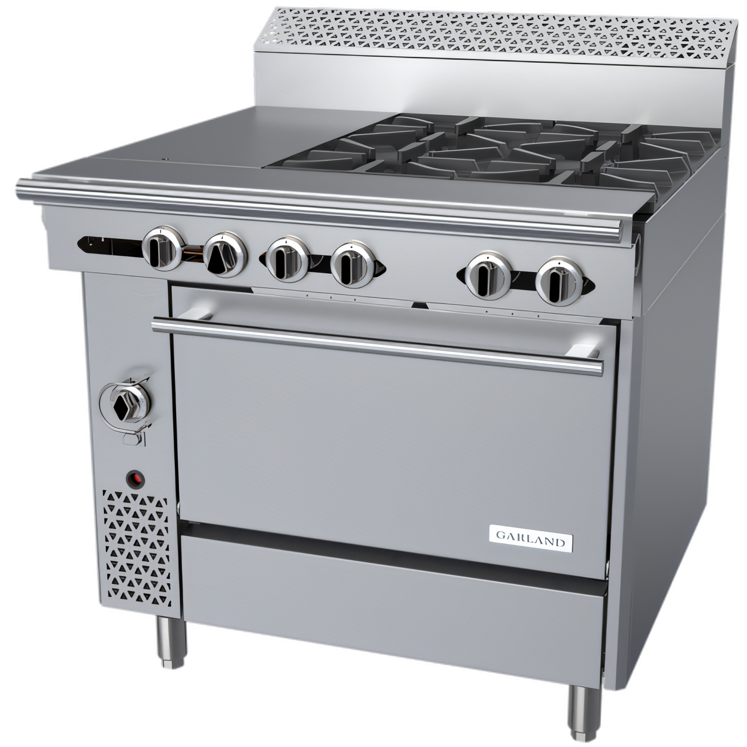 4 × 35,000 BTU Open Burners • 12" Even-Heat Hot Top • Convection Oven • Model C36-13CBuilt on Garland’s rock-solid 36" chassis, this Cuisine Series range delivers 202,000 BTU of menu-driven performance in a single compact footprint. From high-output open burners to a gentle simmering hot top and a fast-recovery convection oven, it equips your line to sear, sauté, hold and bake—without compromise.