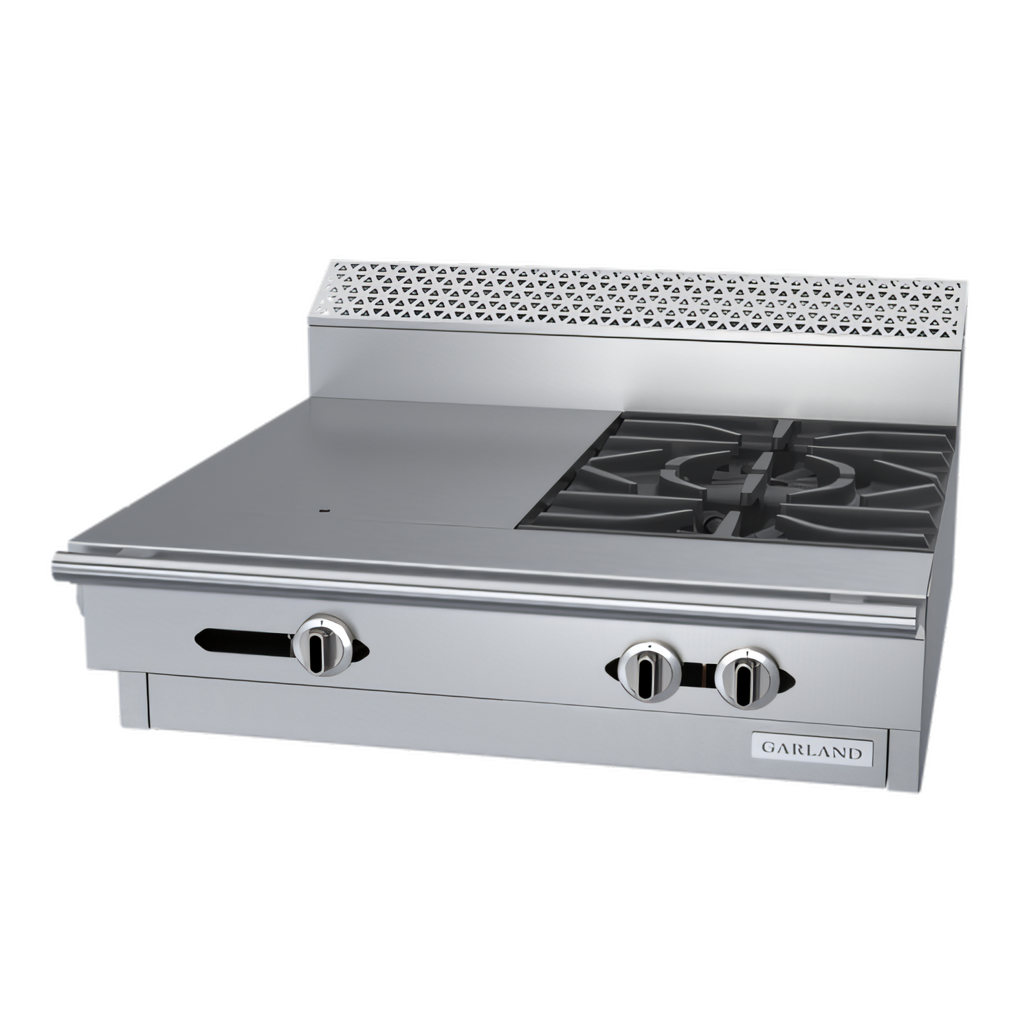 2 Open Burners + 18" Even-Heat Hot Top • 112,500 BTU/h Natural GasBuilt for chefs who demand versatility, speed and rugged durability, the Garland C36-14M combines two 40,000 BTU Starfire open burners with a 32,500 BTU Even-Heat hot top—giving you instant high-heat sauté power and a steady, uniform surface for sauce pots, braising pans or holding vessels. Its modular design drops directly on an approved equipment stand or refrigerated base, making it the perfect addition or replacement section in a battery line-up.