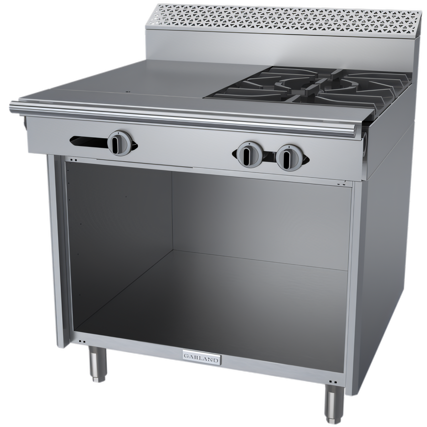 2 x 40,000 BTU Starfire Burners • 18" Even-Heat Hot Top • Open Cabinet Base • 112,500 BTU (NG)Built for the busiest commercial kitchens, the Garland C36-14S delivers the muscle of two 40,000 BTU open burners, the versatility of a 32,500 BTU even-heat hot top, and the convenience of an open storage base—all inside a rugged 36-inch footprint that lines up perfectly with the rest of your Cuisine Series battery.