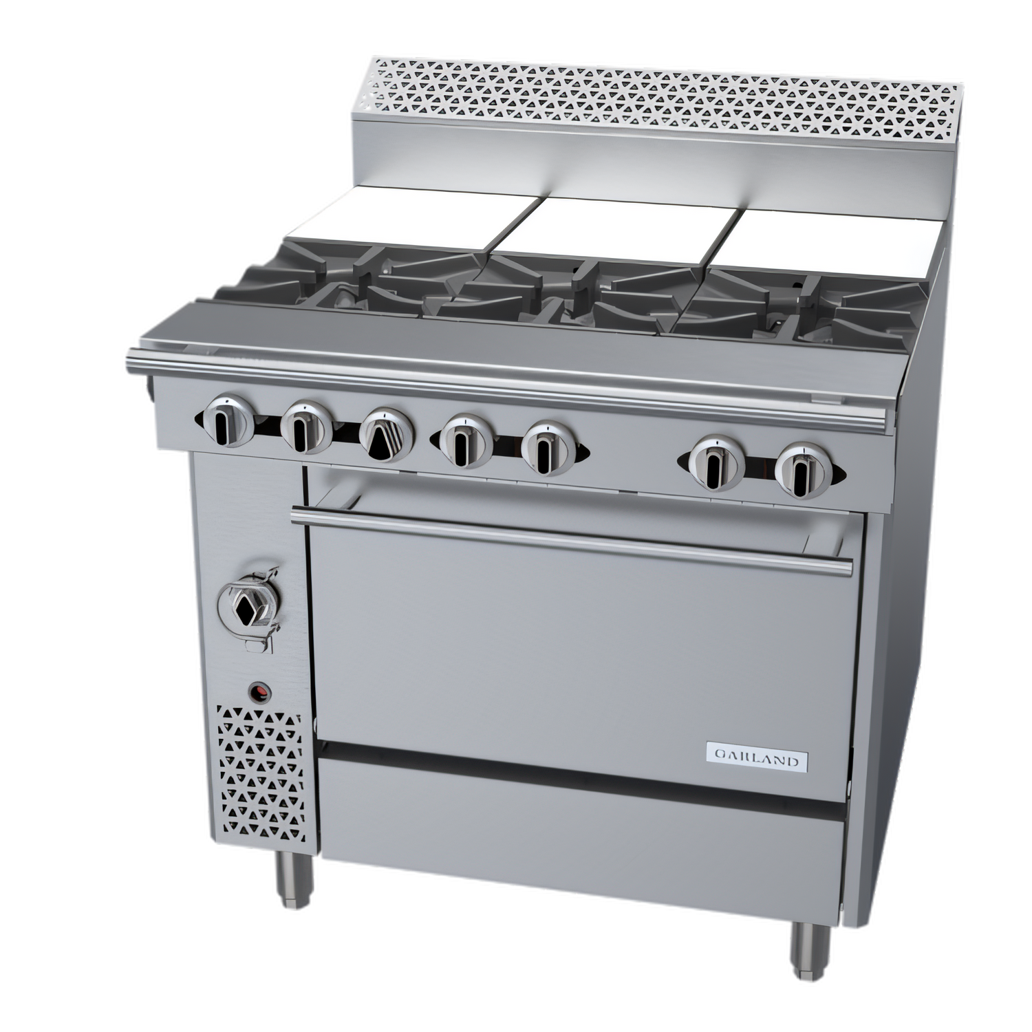 (3) 35,000 BTU Starfire Open Burners + (3) 15,000 BTU Hot Tops with Convection Oven – Model C36-15CBuilt to thrive on the cookline of the busiest commercial kitchens, the Garland C36-15C combines blistering burner power, even-heat hot tops, and a high-performance convection oven in one 36-inch footprint. From high-heat sautéing up front to low-and-slow braises on the rear plates, this range is the all-in-one workhorse you’ve been looking for.