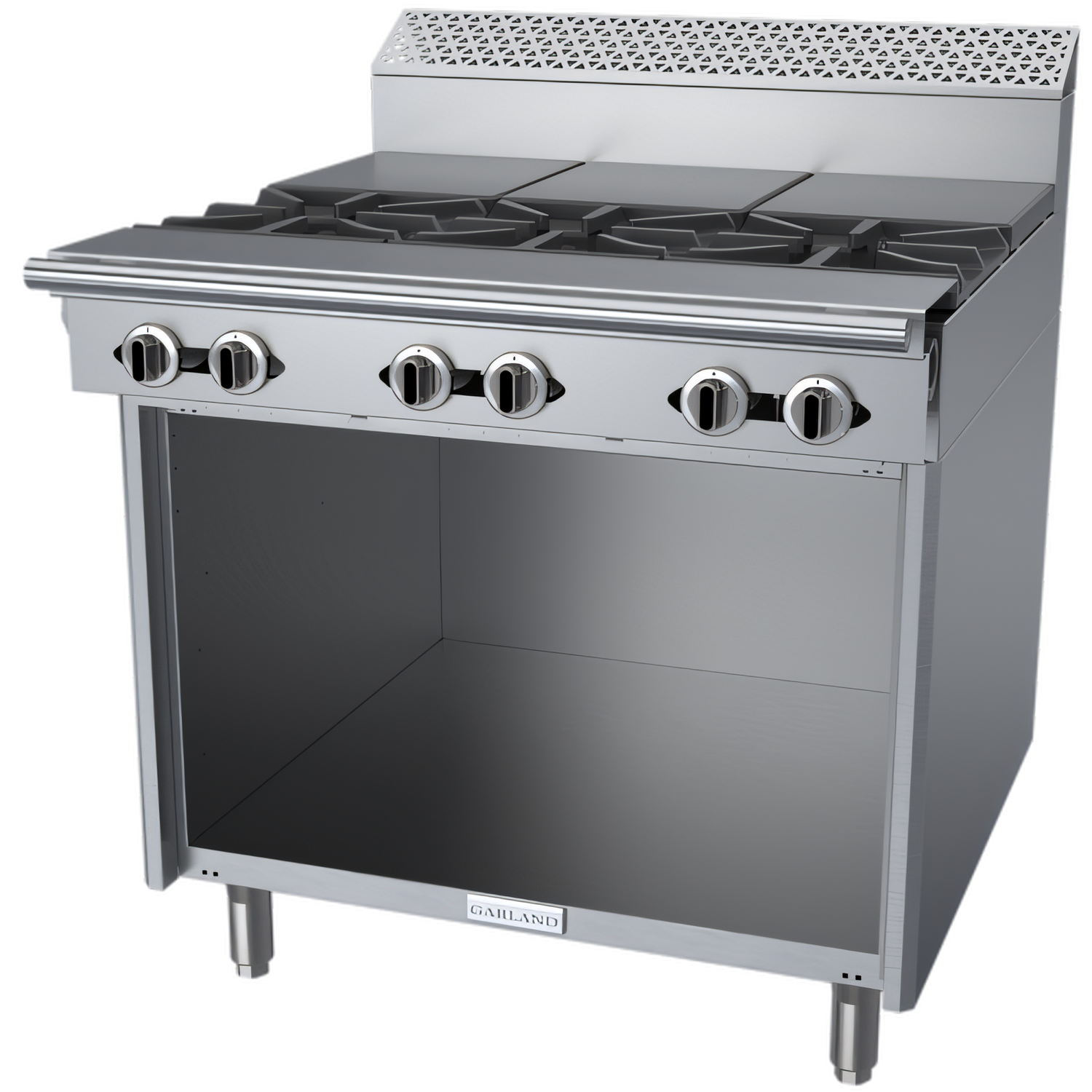 Get the searing power of Garland’s 35,000 BTU Starfire burners and the gentle, even heat of 15,000 BTU hot tops in one ultra-rugged, 36-inch range. The open-cabinet base keeps pans within arm’s reach, while full stainless steel construction stands up to the busiest commercial kitchens.