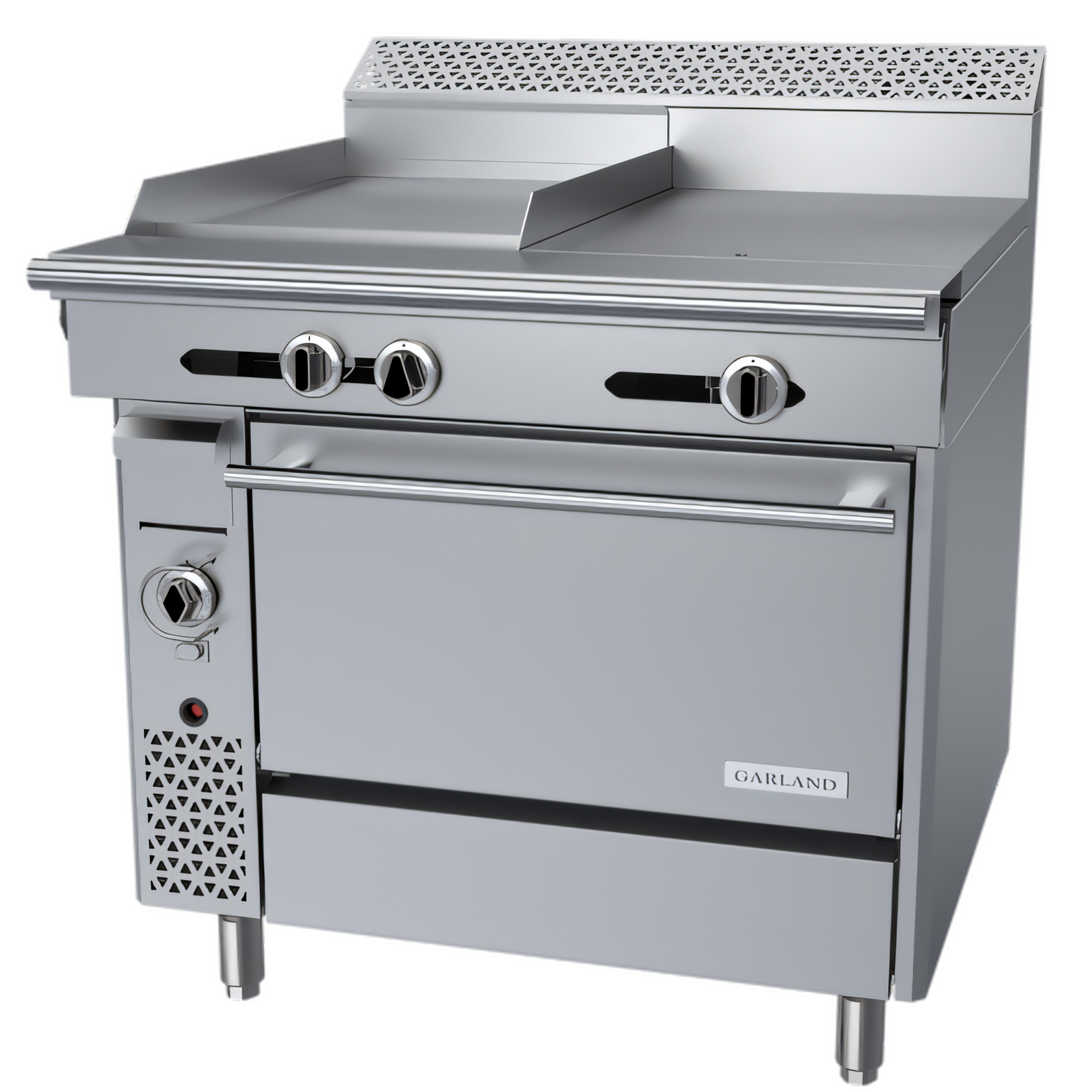 Model C36-5-1C – 18" Griddle & 18" Hot Top with Convection OvenBuilt for chefs who refuse to compromise, the Garland Cuisine Series 36" combination range delivers 99,500 BTU/h of consistent, controllable power in a rock-solid, stainless-steel chassis. A 1" thick thermostatic griddle, an even-heat hot top and a high-performance convection oven give you the freedom to sear, sauté, simmer — and bake — all on one compact footprint.