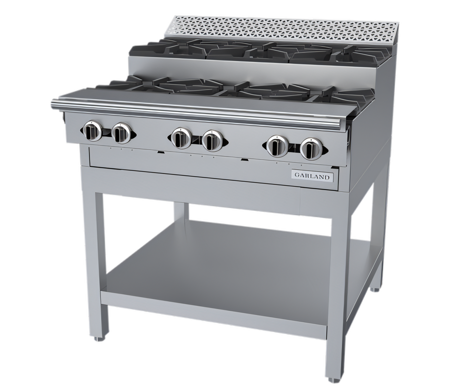 - Six Garland Starfire open burners (35,000 BTU/h each) – three in front, three step-up in back.