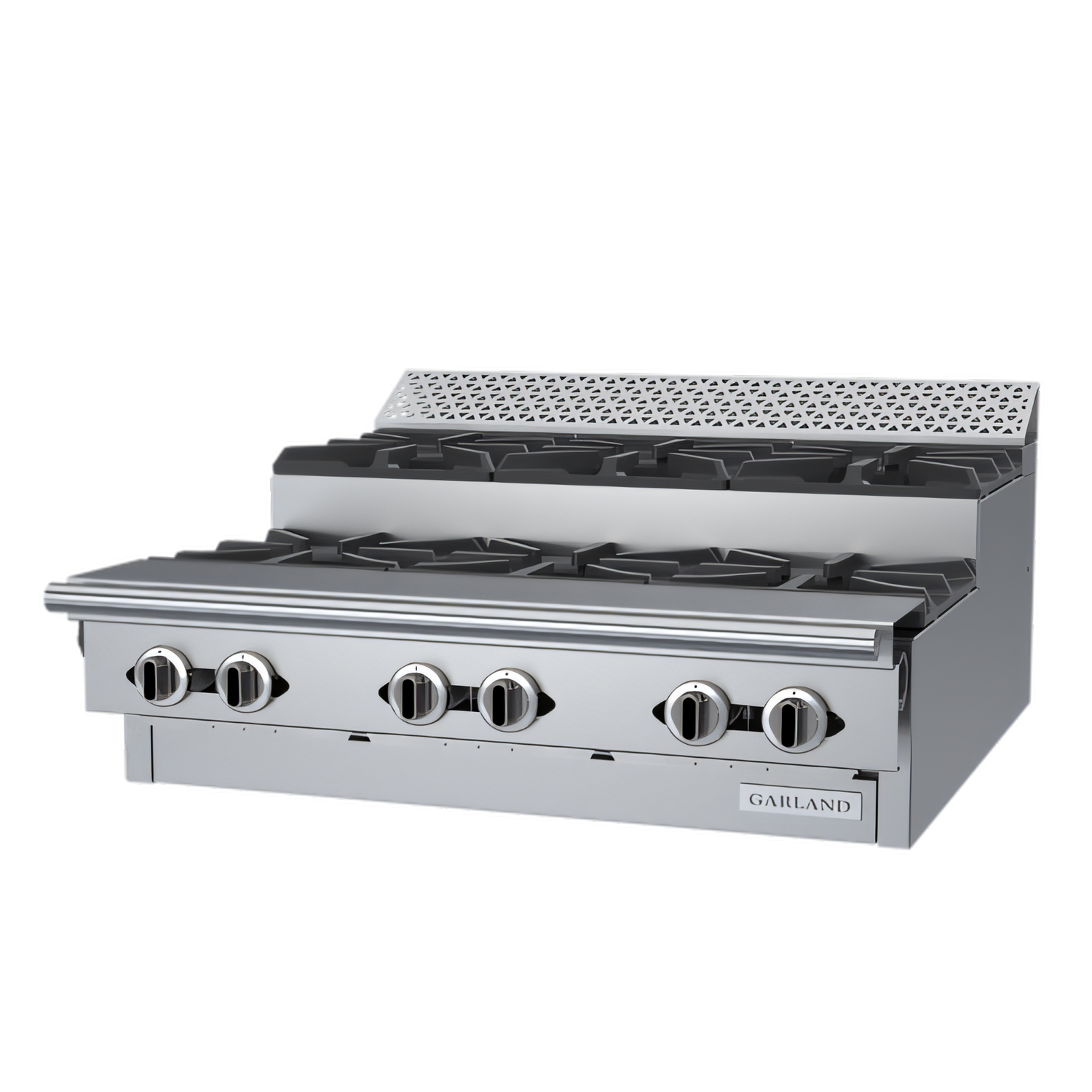 Model C36-6SUM | 210,000 BTU/h | Natural or Propane GasPurpose-built for the busiest commercial kitchens, the Garland Cuisine Series 36" Step-Up Range delivers six powerful 35,000 BTU/h Starfire open burners on a space-saving modular chassis that drops straight onto your refrigerated base, equipment stand or cabinet. A 4" step elevates the rear row of burners for improved pan visibility and easier plating while the 7" stainless stub backguard protects surrounding surfaces.