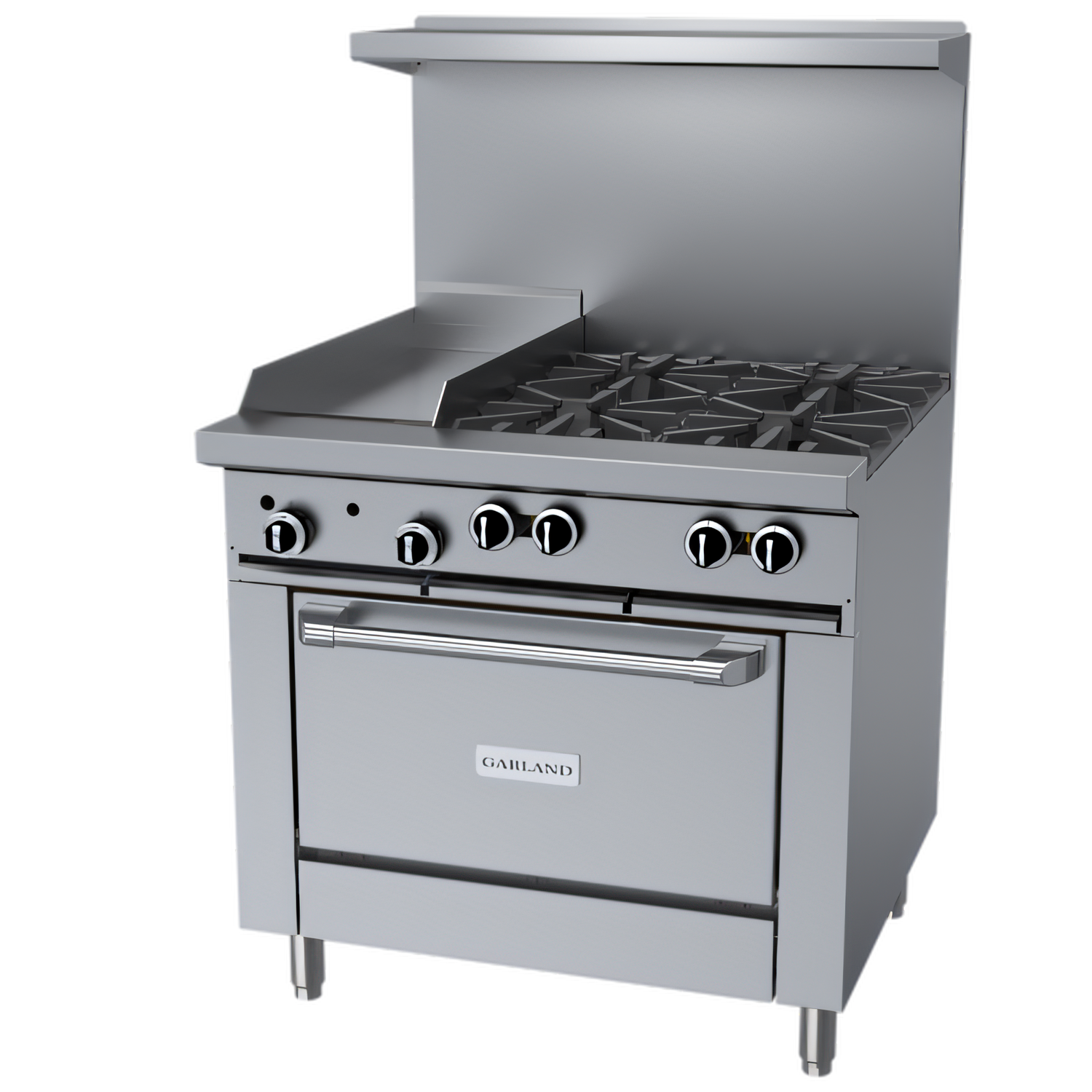 4 Open Burners • 12" Griddle • Standard Oven • 188,000 BTUEngineered for demanding commercial kitchens, the Garland G Starfire Pro packs high-output Starfire Pro® burners, a true heavy-duty griddle, and a fast-recovery oven into a single 36 inch footprint. From breakfast rush to dinner service, this range delivers the power, precision, and durability chefs expect from Garland.