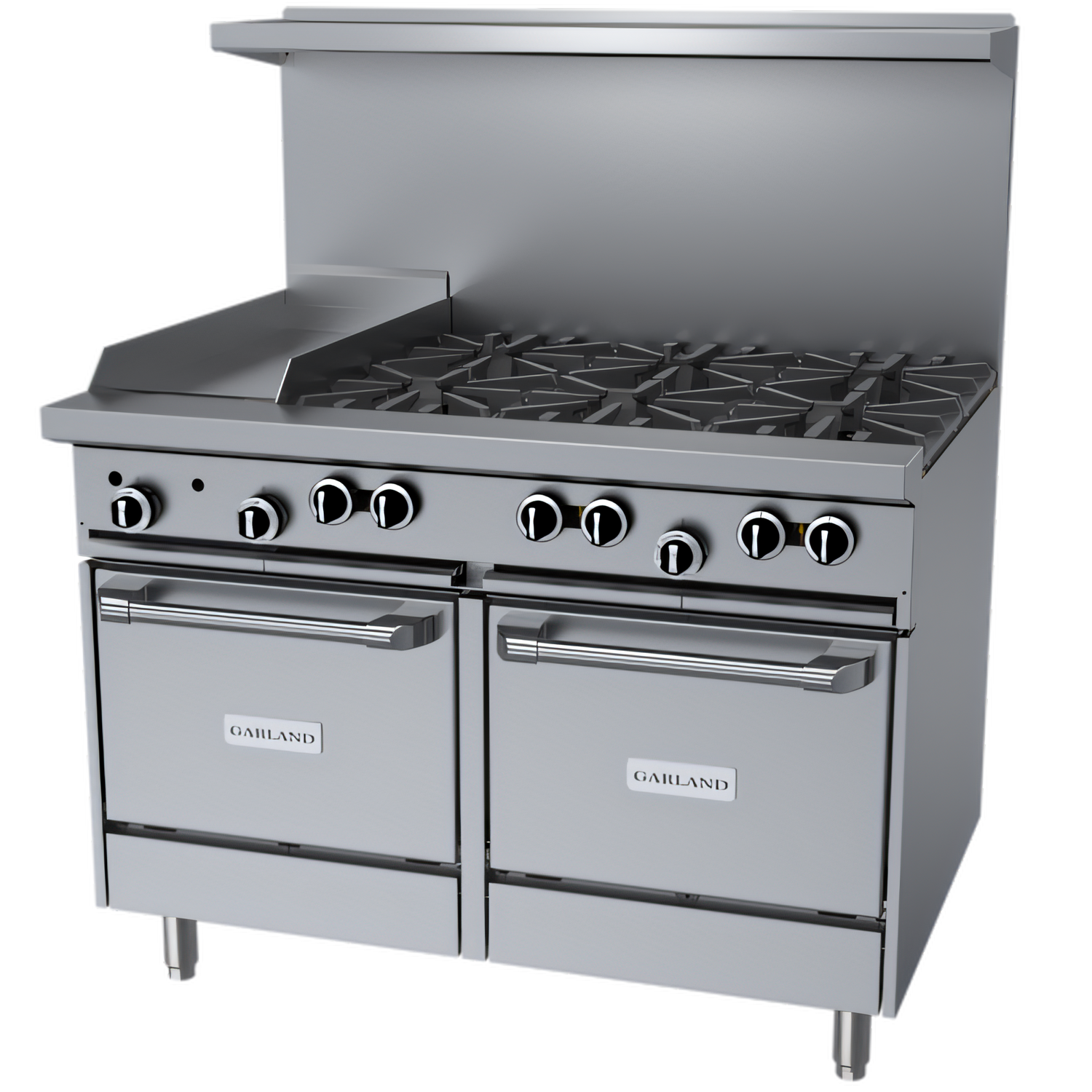 6 Open Burners • 12" Griddle • Double Space-Saver Ovens • 280,000 BTUEngineered for high-volume kitchens, the Garland G Starfire Pro combines powerhouse performance with the rugged reliability for which Garland is renowned—all in a convenient 48-inch footprint.