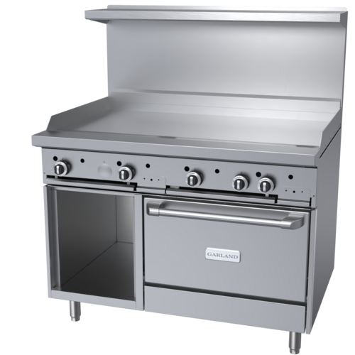 G Starfire Pro Series Restaurant Range, gas, 48", (1) griddle, 5/8" thick smooth steel plate, (1) convection oven & (1) storage base, 3 position rack guides, (3) racks, stainless steel front, sides, plate rail, 2-piece back guard & shelf, 6" stainless steel legs, adjustable feet, 110,000 BTU, CSA Flame, CSA Star, cCSAus, NSF (Garland)