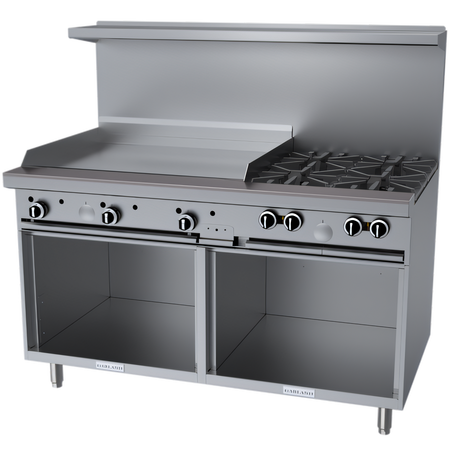 4 Starfire-Pro Open Burners • 36" Smooth-Steel Griddle • Twin Storage BasesBring powerhouse performance to your cookline with the Garland G Starfire Pro. This 60-inch range marries four 33,000 BTU Starfire-Pro open burners with a full-size 36" x 23" griddle, giving chefs the versatility to sear, sauté, grill, and hold—all on one rugged surface.