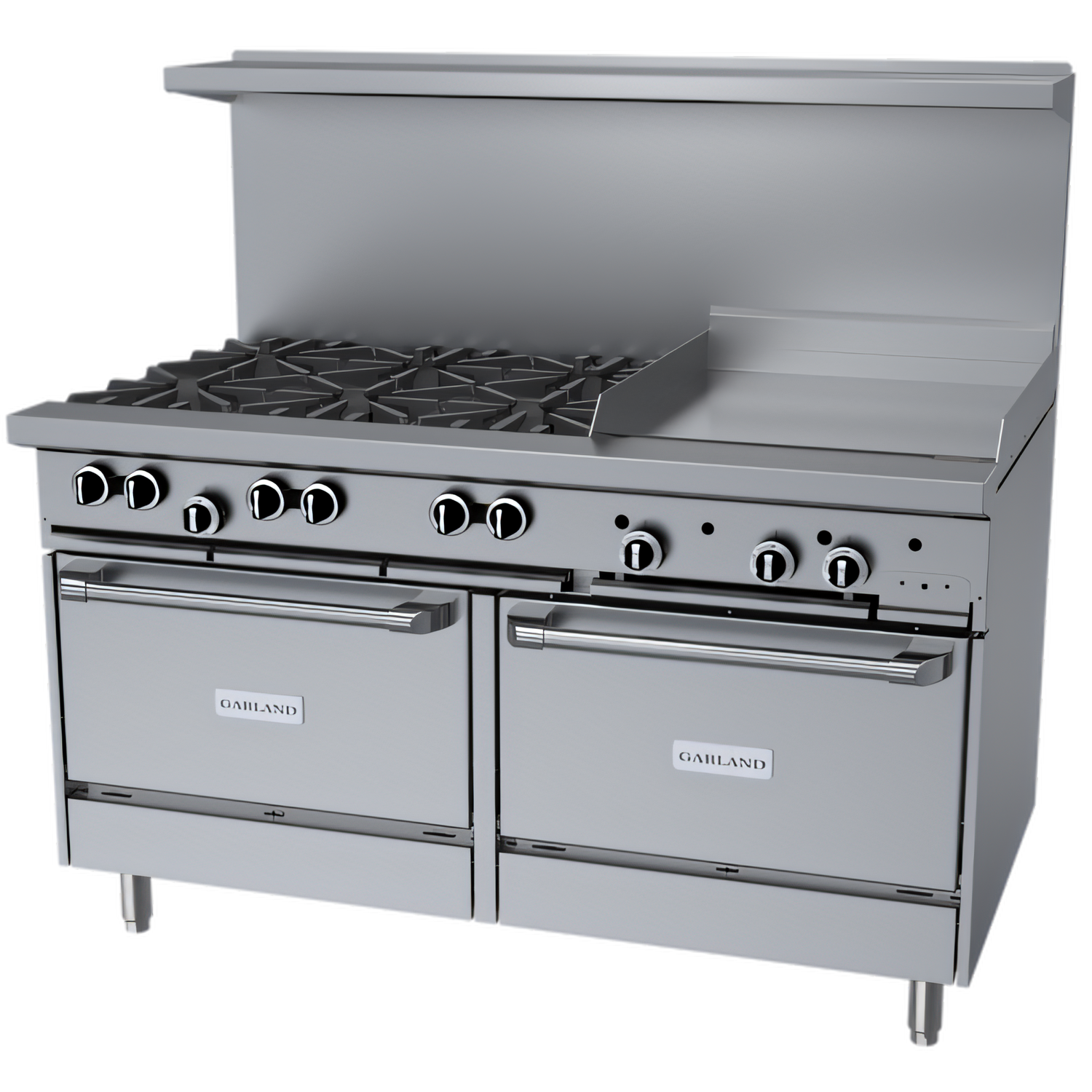 6-Burner • 24" Griddle • Dual Standard Ovens • 310,000 BTUEngineered for high-volume, all-day service, the Garland G Starfire Pro combines the power of six 33 000 BTU open burners with a full-size 24" x 23" griddle and two heavy-duty ovens—giving chefs the versatility of three cooking platforms in one rock-solid, 60-inch footprint.