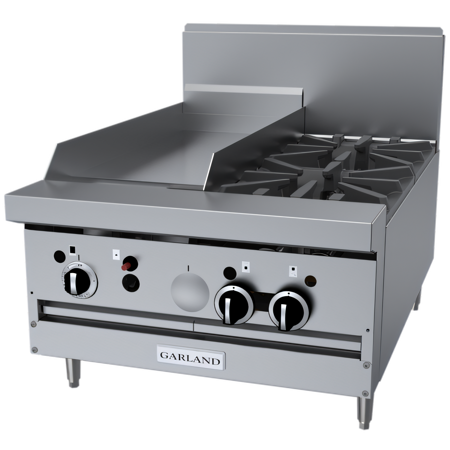 Model GF24-2G12T – 2 Open Burners + 12" Thermostatic GriddlePower, precision and a footprint that fits anywhere—all in one rugged unit. The Garland GF Starfire Pro 24" modular range-top delivers a combined 70,000 BTU/h from two 26,000 BTU Starfire Pro burners and a snap-action 12" griddle, giving chefs the speed of an open range with the versatility of a griddle in just 24 inches of line space.